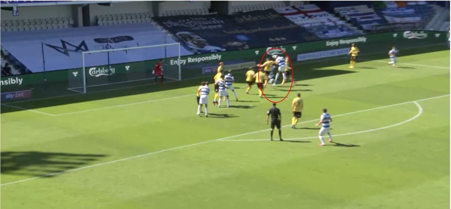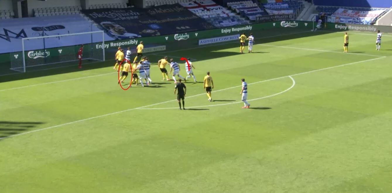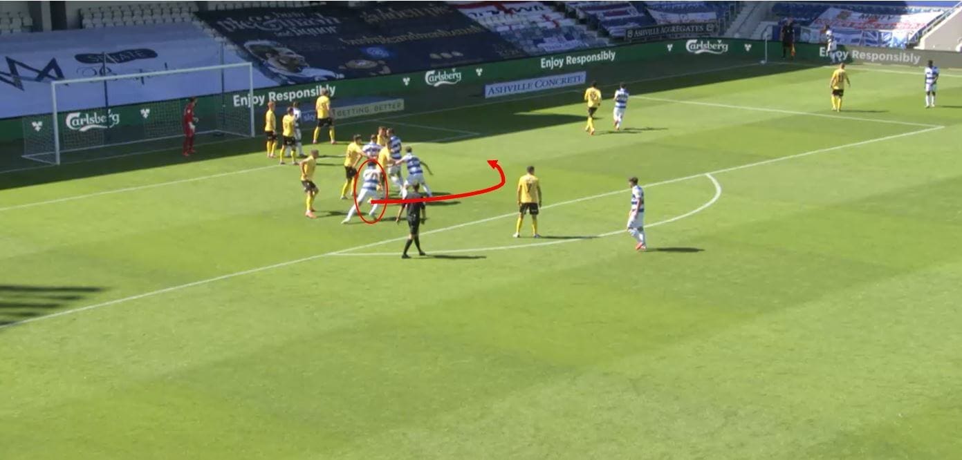 Because the target player runs in the direction of the cluster, his marker can’t follow and has to find another route. He instead has to run around the cluster in the other direction. This obviously adds time to his run and creates massive separation between the pair, and with an excellent delivery into the exact zone needed, QPR could find success.