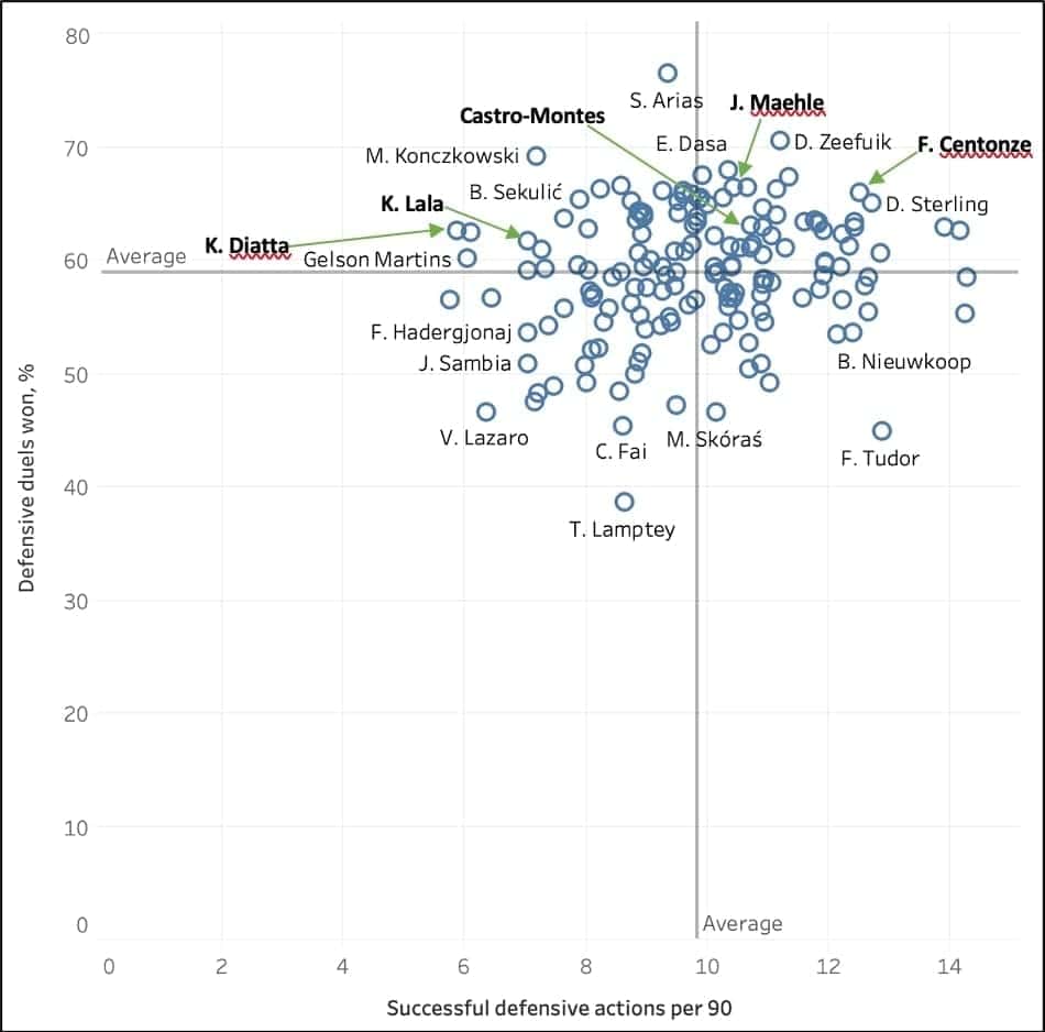Kenny Lala (29 years old, RC Strasbourg, market value: £9m): This French player has become a key player in an inventive Strasbourg side, frequently playing at wing-back in a three or five at the back, matching him well with Potter’s tactical system. Whilst he is slightly older at 29 and probably reaching his peak potential already, he would be a capable and reliable alternate on either wing. In the absence of Lamptey, and his experience could help support and develop Lamptey as well even further. Whilst he does rank below average in successful defensive actions per 90, he ranks slightly above in % of defensive duels won. His attacking and progressive ability are what make him stand out as a reliable option for Potter’s side, with an above-average % of successful dribbles at 64% and a way above average of 3.7 progressive runs per 90.
