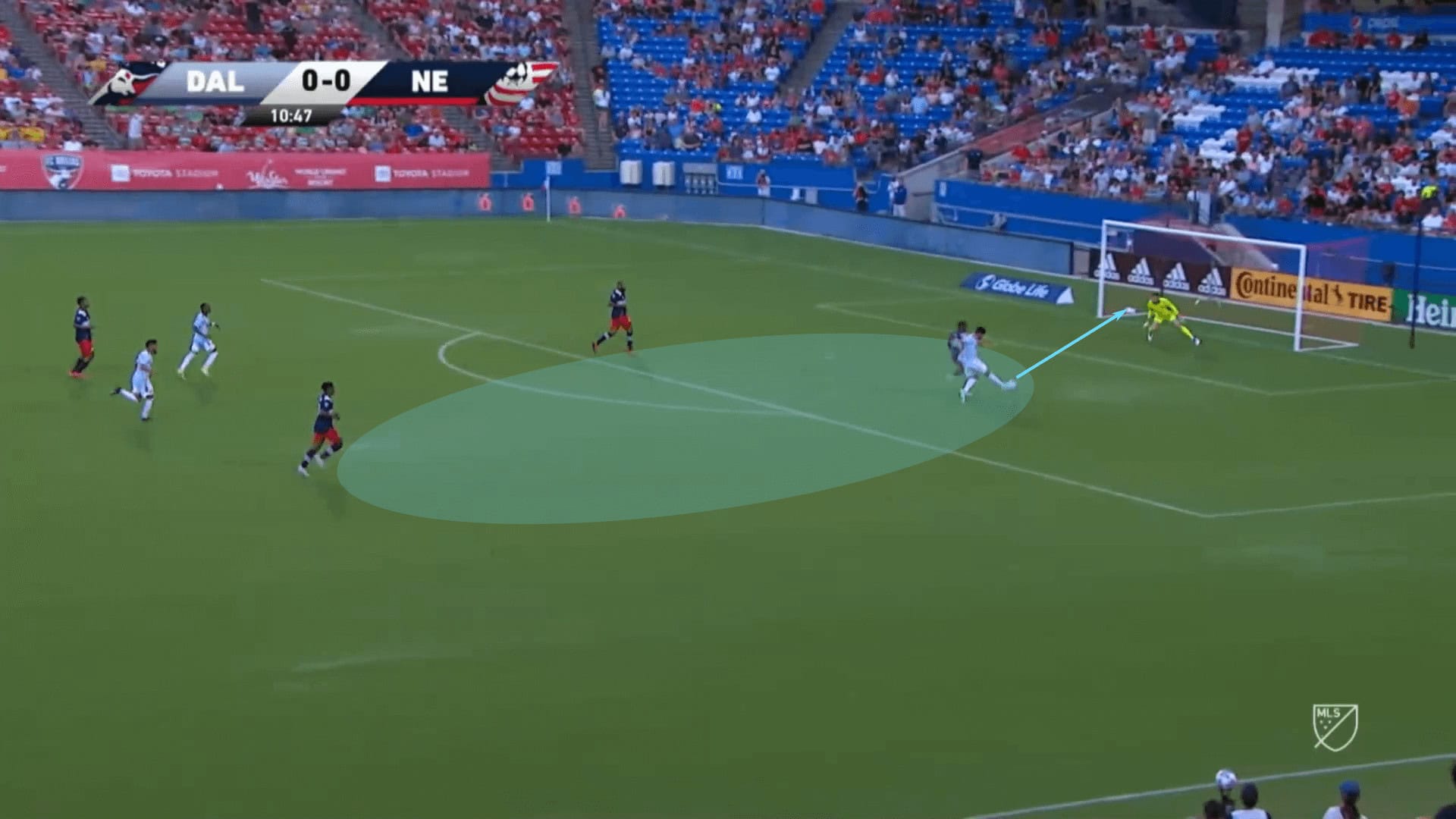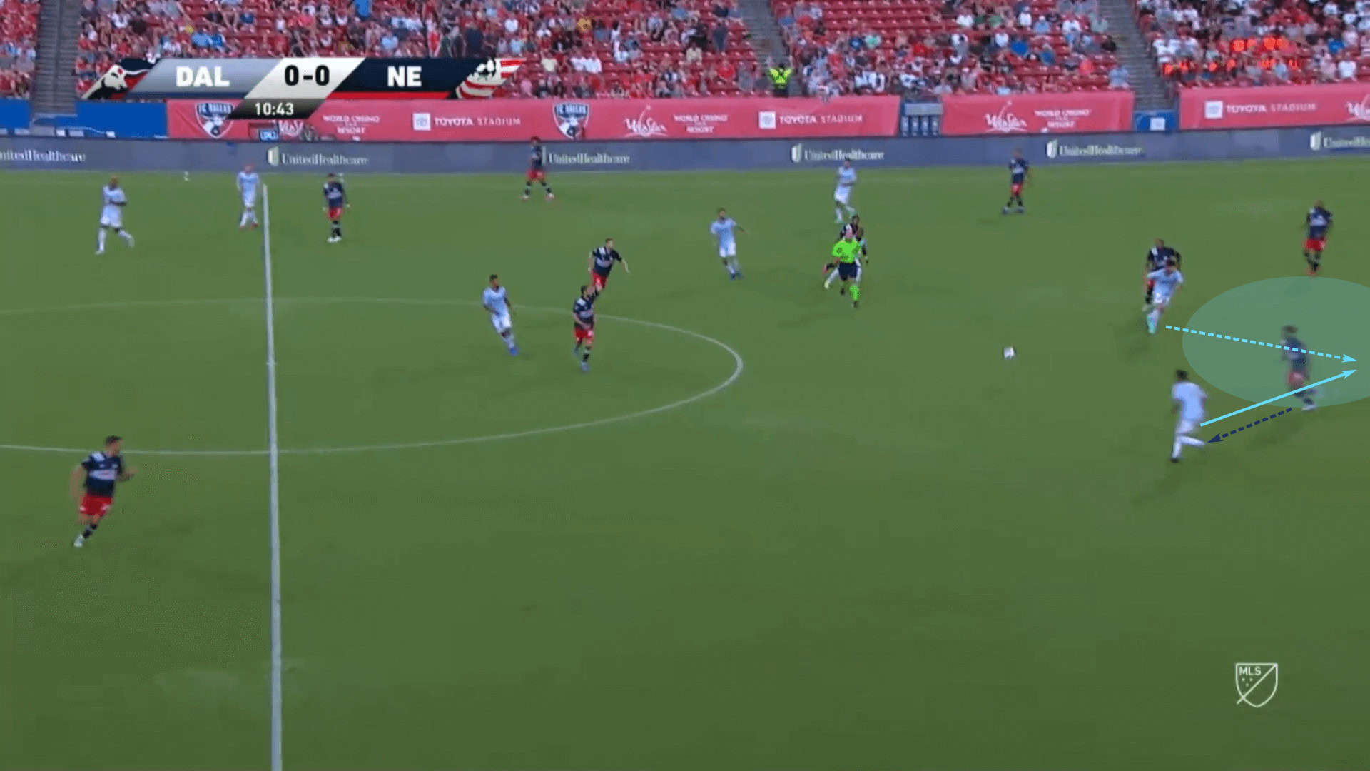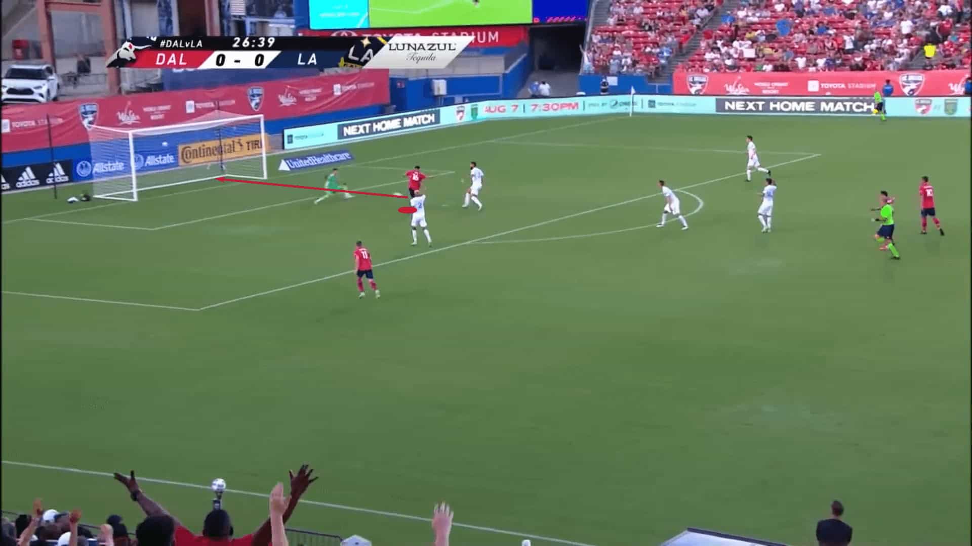 The sequence from the last section showed Pepi taking his first touch between the gaps in the Los Angeles Galaxy backline, but with his willingness to stretch the pitch vertically and his excellent starting positions, making him more difficult to track his initial steps, Dallas will look to play through passes into the path of Pepi, as well as over the top.