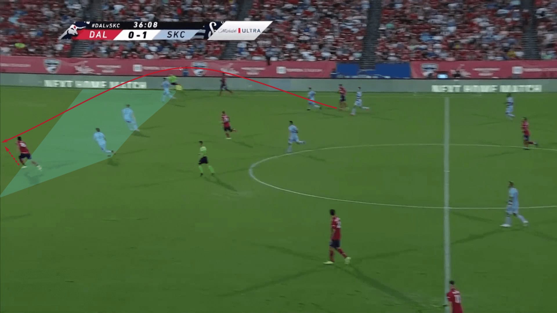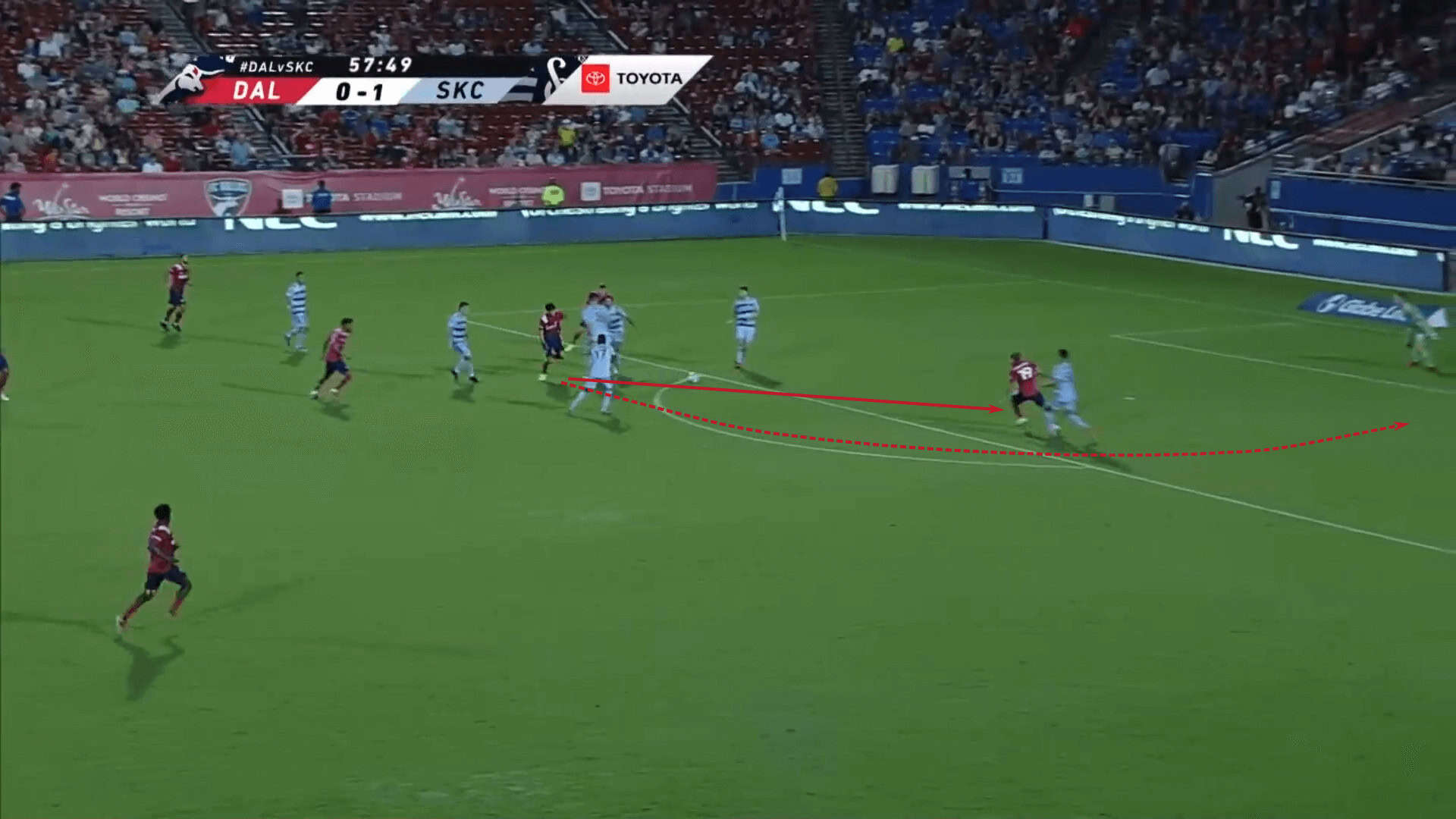 Against Sporting Kansas City, Dallas did well to disconnect the backline, drawing the right-back behind the three remaining defenders. With those extra meters of space, Pepi burst into action, latching onto a ball played over the top.