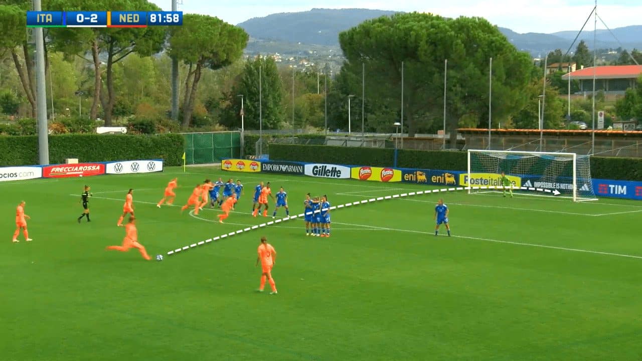 This free-kick against Italy was scored from a more distant spot, which shows that Leuchter can score from different positions and adapts her shooting technique based on the circumstances and the shooting spot. This creativity in set-piece execution guarantees her ability to score from such situations and keep confusing goalkeepers.