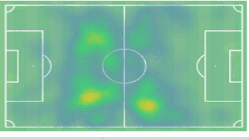 We can see that the player spent a fair bit of time all across the centre of midfield in the deeper position, while in the more advanced areas of the pitch, he rarely ventured into the more central zones, typically holding his position in wider areas of the pitch.