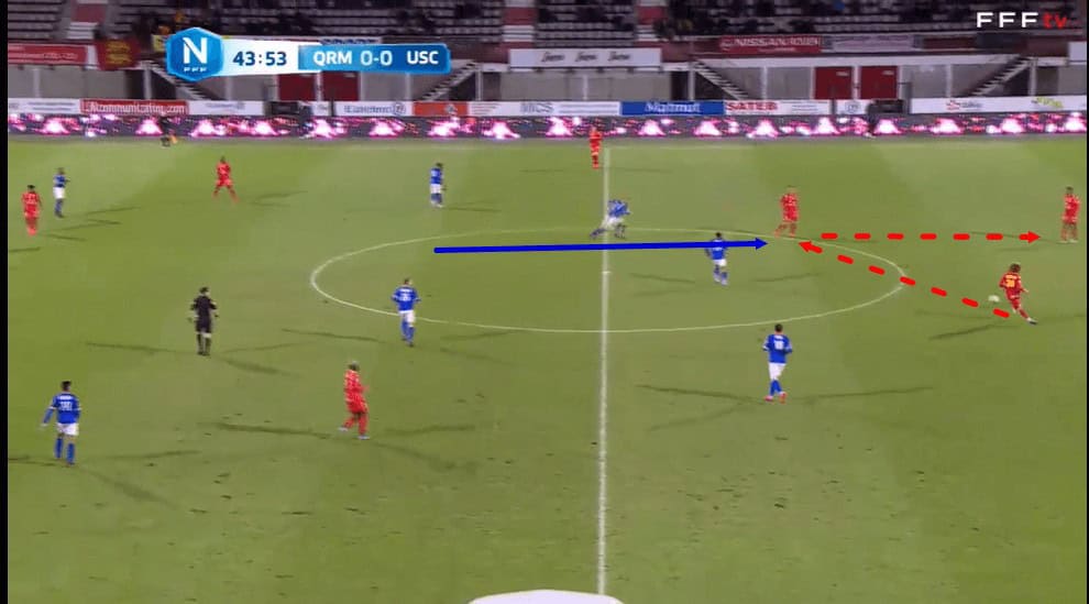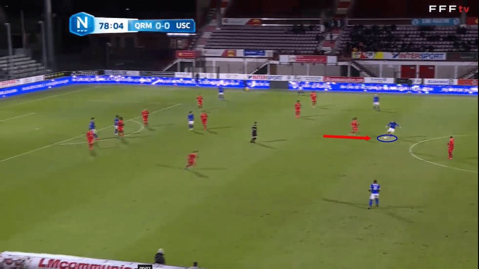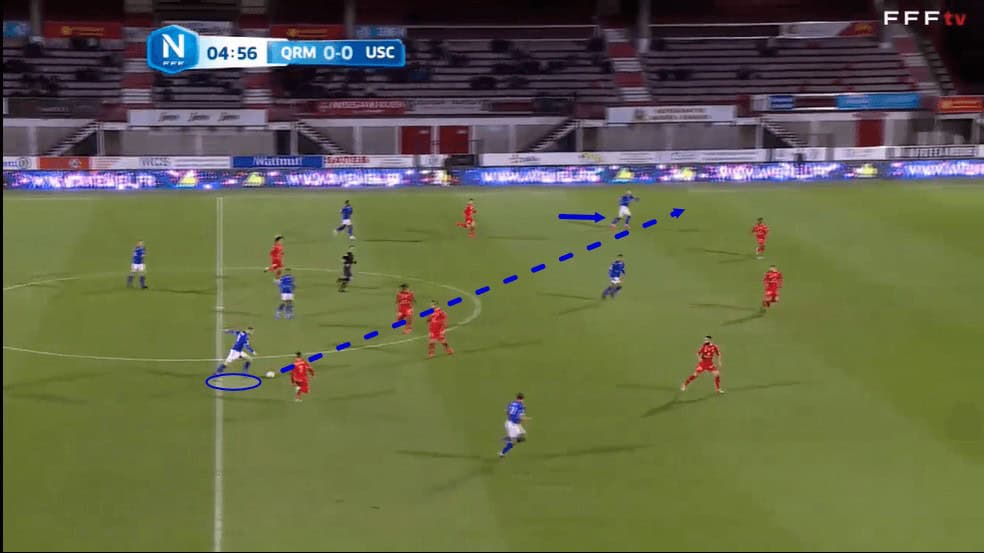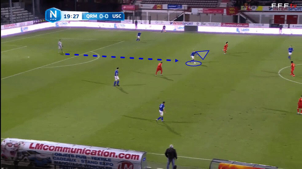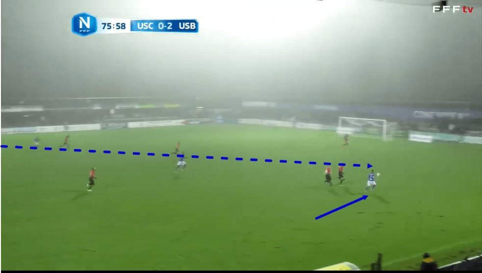 In possession, Bernauer often found himself in this right central midfield position that we can see him occupying in the image above. As a result of the midfielder’s long-ball-playing quality, Concarneau often tried to set up this diagonal cross-field ball which we can see Bernauer lining up, aiming for the left-winger, in this particular passage of play.