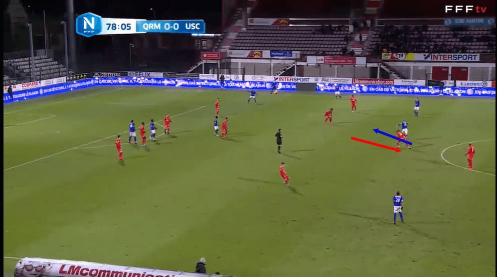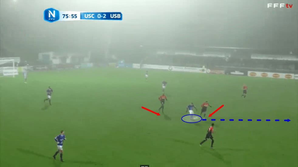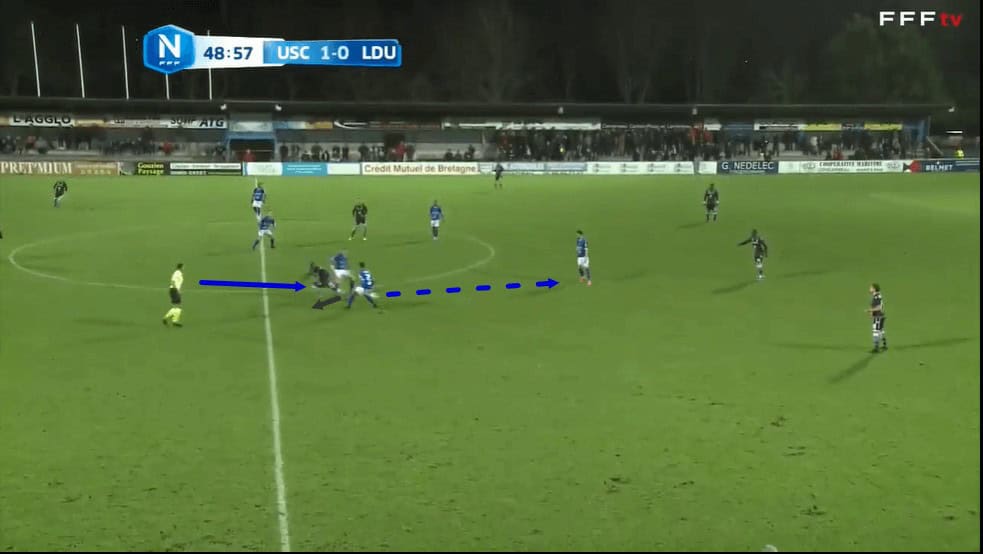Then, just one second later in this passage of play, the receiver attempts to turn and face Concarneau’s goal as the ball reaches him, but Bernauer is already right behind him, ready to prevent the player from taking the ball out of his own half.