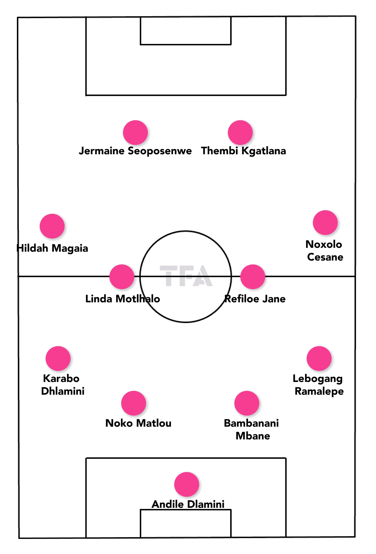 The midfield four is less straightforward because there have been fluctuations in Ellis’ selection, and it was certainly the case during last year’s WAFCON tournament that players were shifted around to cover key absences. However, when everyone is fit, the central midfield is likely to be made up of Sassuolo Femminile’s Refiloe Jane and Glasgow City’s Linda Motlhalo, as that ensures that they can both break up opposing attacks and create opportunities further forward. Outside them, it is likely that Noxolo Cesane and Hildah Magaia of UANL Tigres Femenil and Sejong Sportstoto Women, respectively, will start.