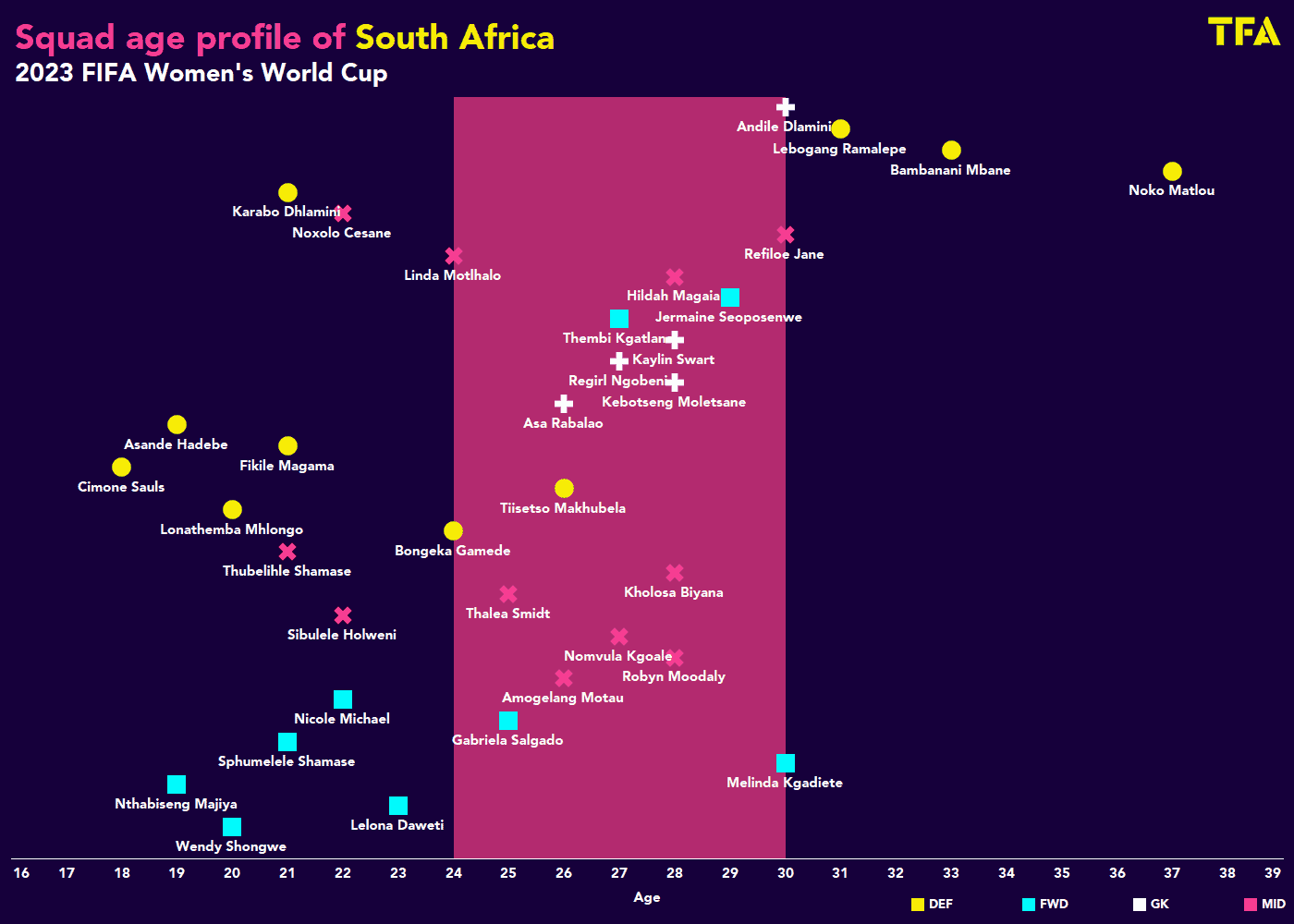 As mentioned, though, the midfielders who tend to start games are in their peak years, so there is not the same difference in ages as there is in the defensive line. Instead, it comes down to qualities and which player combinations work that dictates who starts and who is left on the bench. The fact that Ellis has been known to rotate in the central third means that the likes of Sibulele Holweni, who can double up as a left-back if needed, Kholosa Biyana, Nomvula Kgoale and Robyn Moodaly could all make appearances during the tournament.