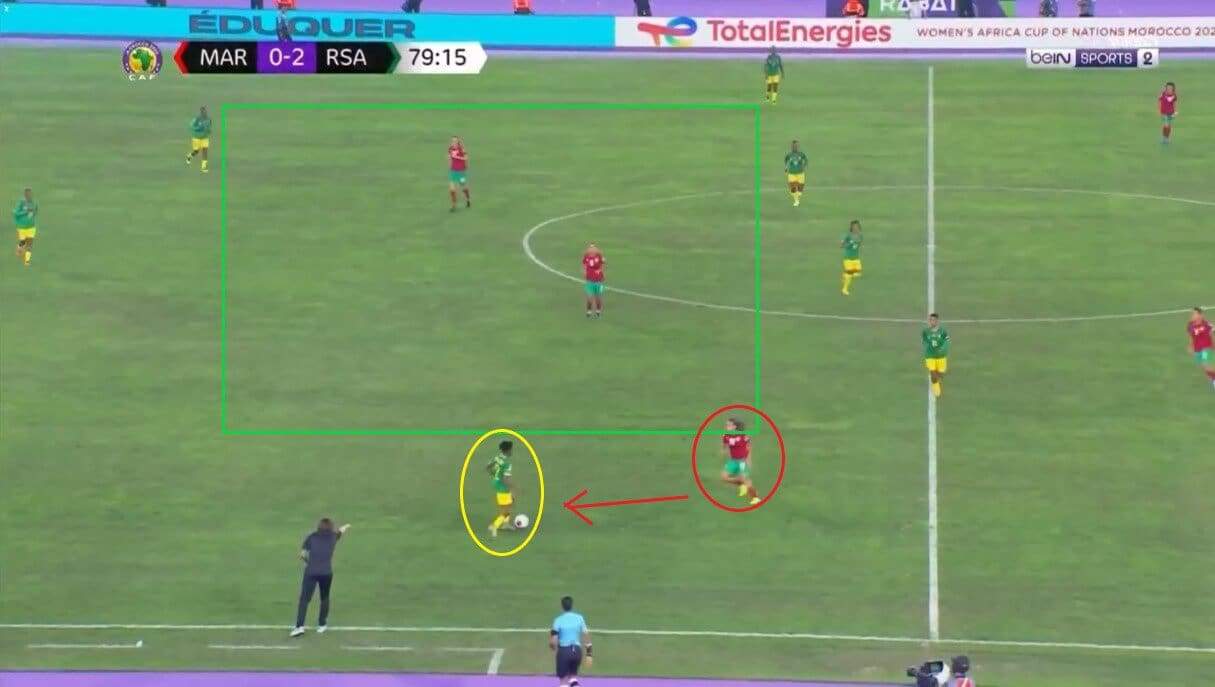 When they don’t have time to get players behind the ball, things are even more difficult for them, and quick transitions by opponents do often catch them out. In this case, during the latter stages of the WAFCON final last year, Ramalepe gives the ball to Morocco forward Fatima Tagnaout and invites the North Africans to push forward and put the back line under pressure, and Morocco are a team that don’t need a second invitation in moments like this and they often take full advantage of opposing errors.
