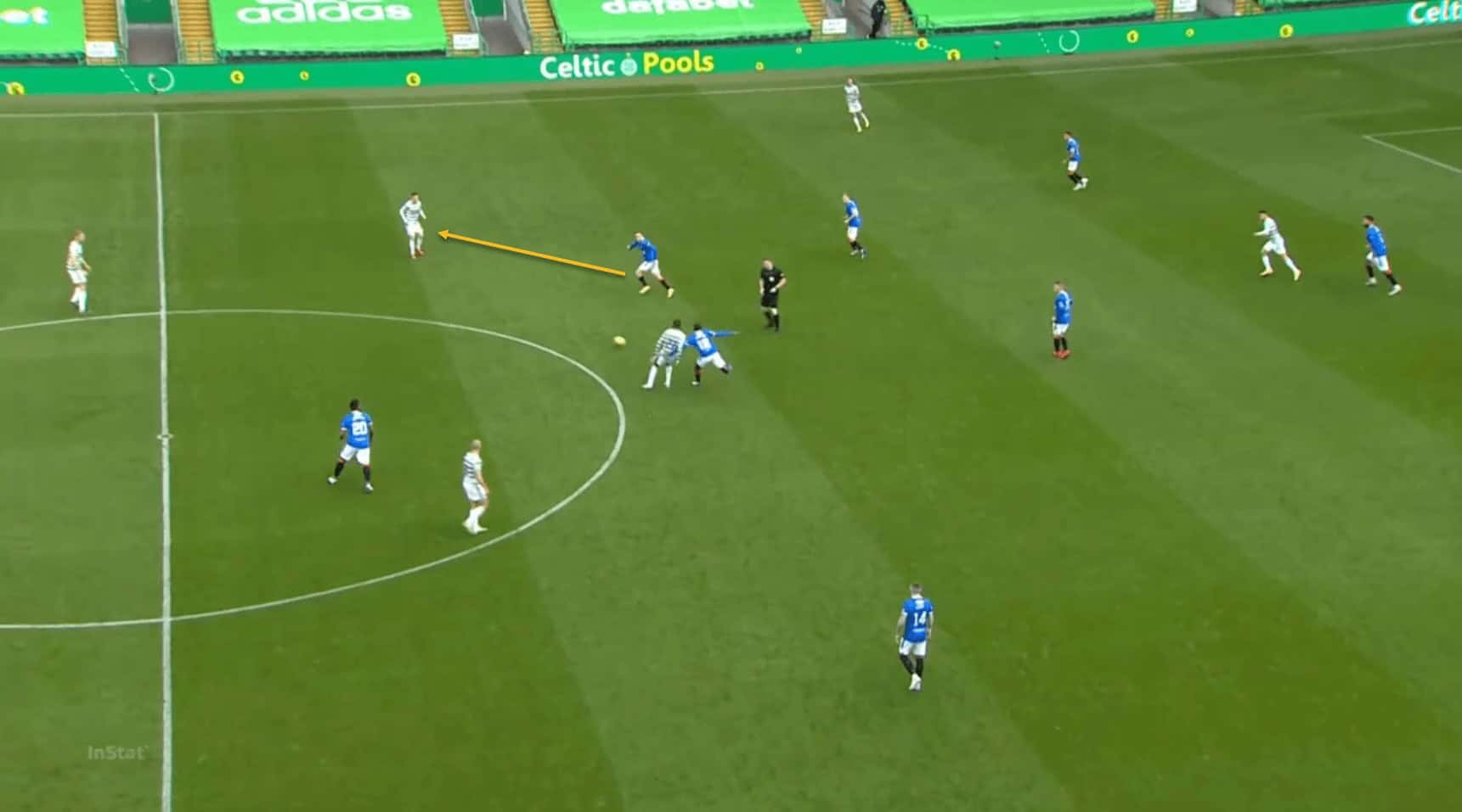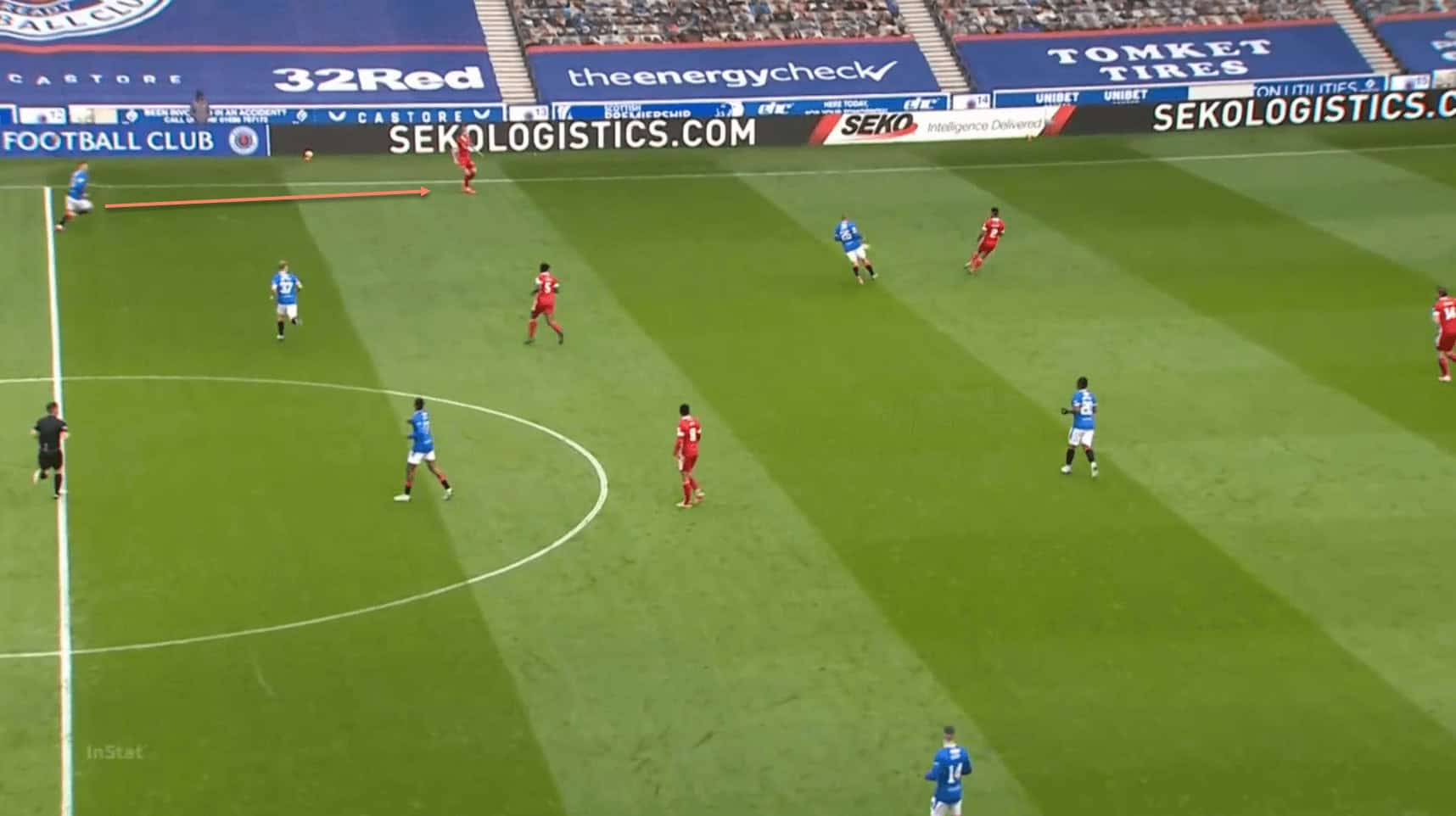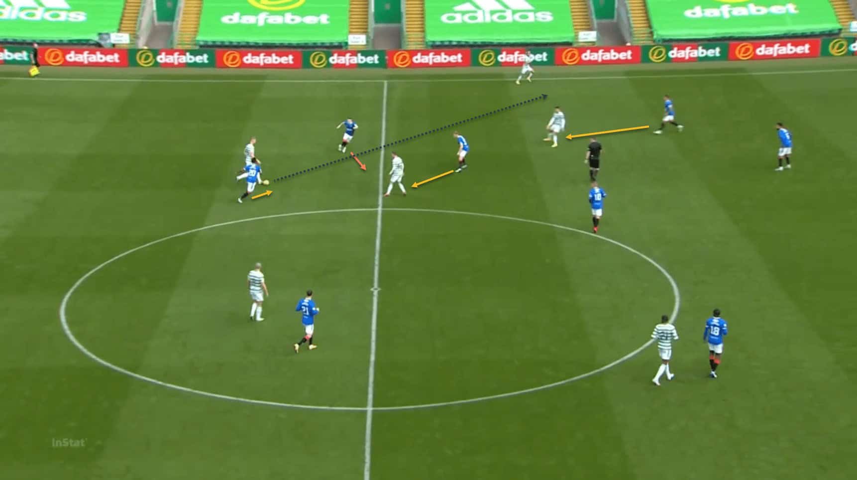 This press resulted in a turnover of possession in the middle third of the pitch, sparking a Rangers counter-attack.