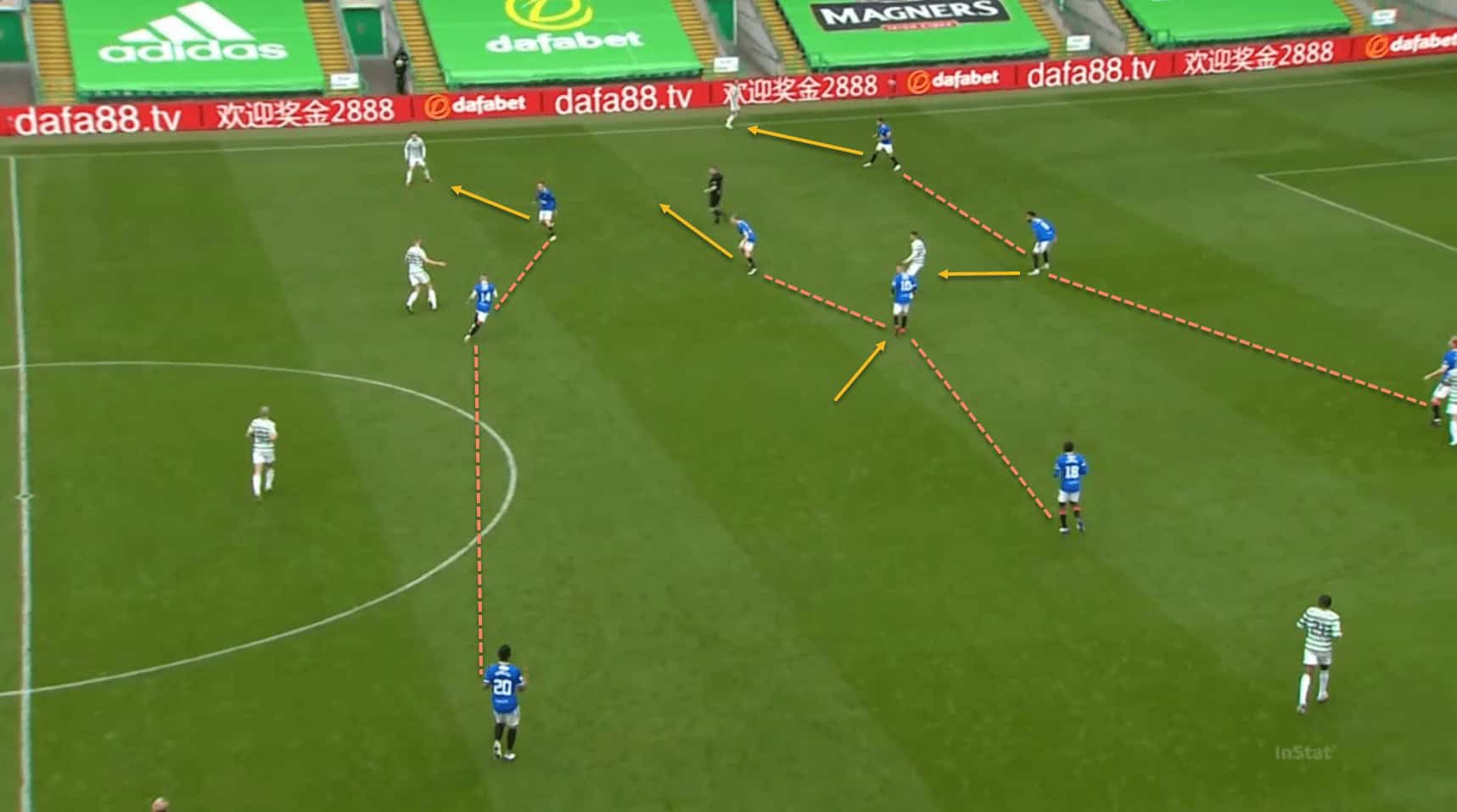 Another example of Rangers’ excellent structure – the midfield and defensive lines are extremely compact, while the front three is in position to press.