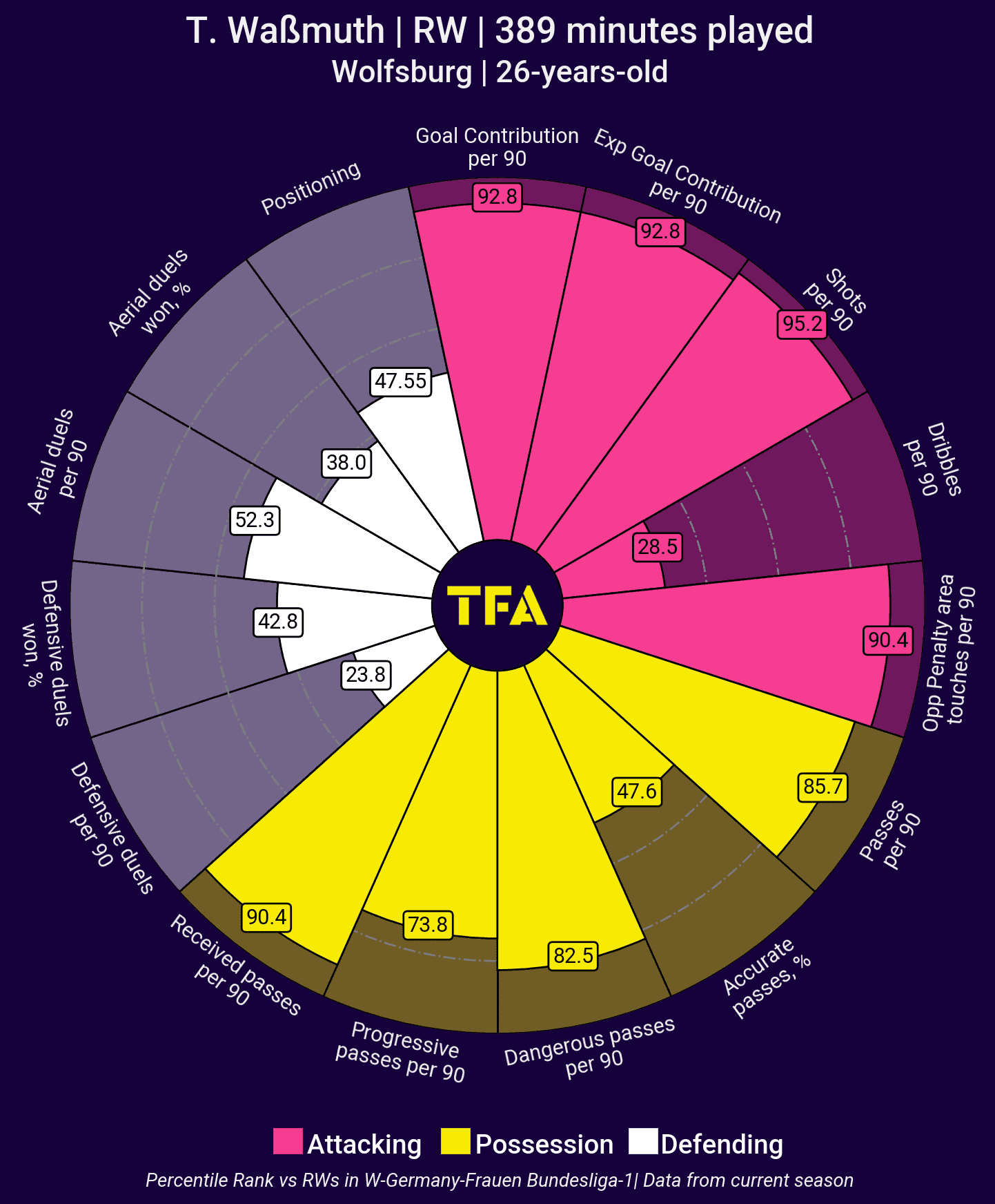 According to the following pizza map, Waßmuth’s goal contribution stats are more than outstanding, and if she keeps having these same stats regularly, she might become the best in her position in terms of numbers. Even when it comes to shooting, Waßmuth has got an exceptional stat per 90.