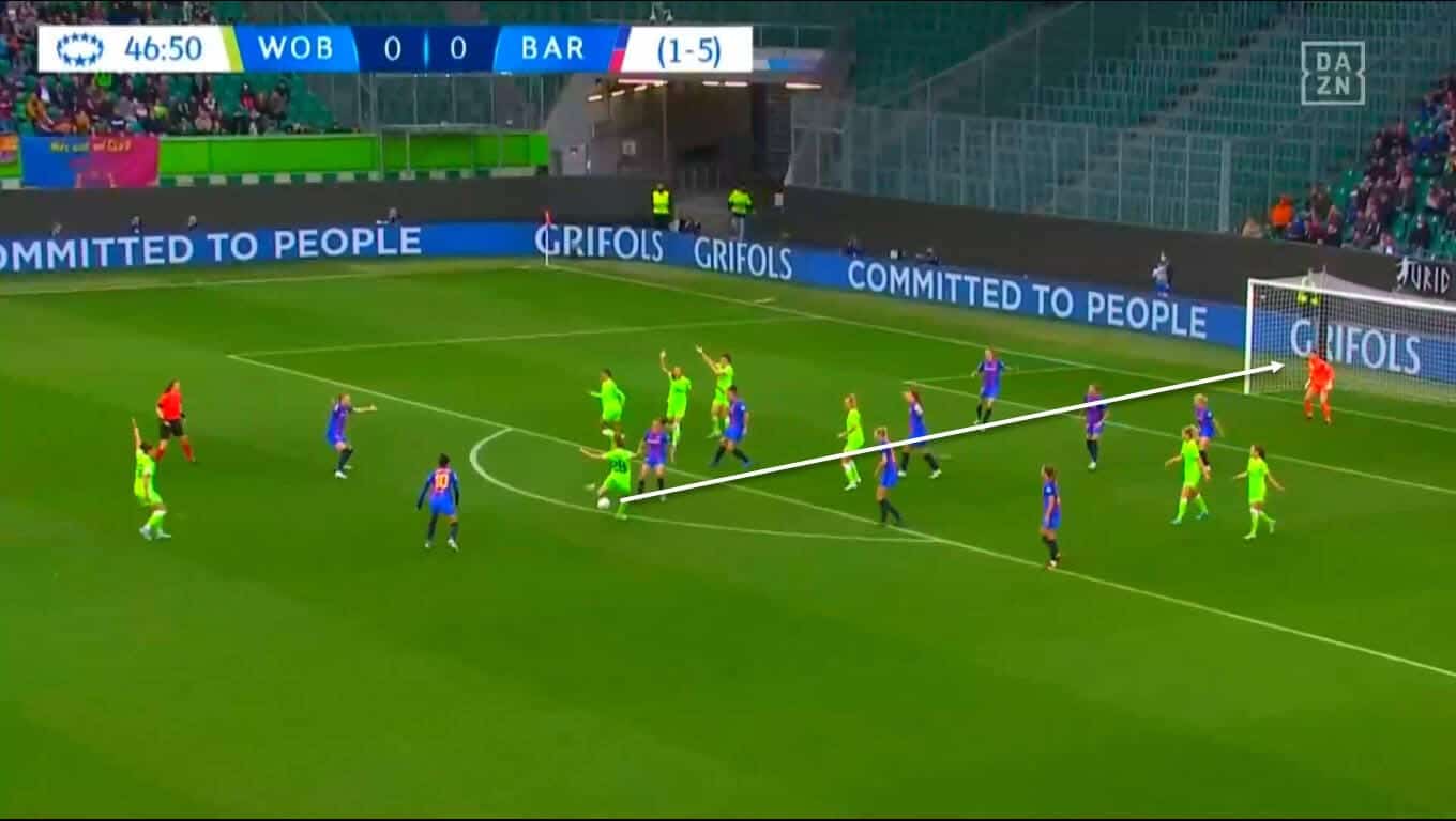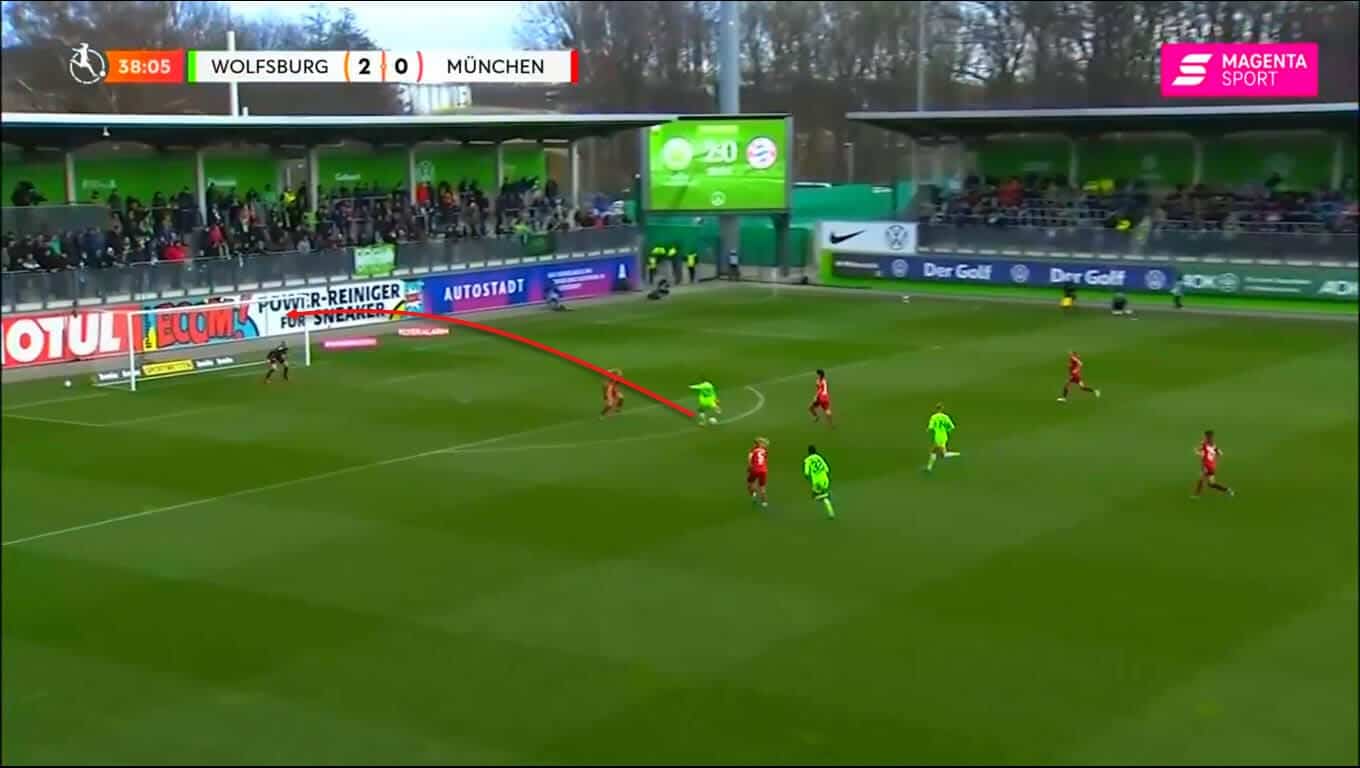 More importantly, Waßmuth’s consistency in providing accurate crosses when playing on the right wing makes her a very useful part of Wolfsburg’s tactics, since they rely on her a lot in terms of crossing to strikers, as she has the quality needed to always deliver crosses and passes that create dangerous opportunities for her team. The following example shows one of Waßmuth’s successful crosses in the sense that this cross was accurately delivered and well-finished by the striker. Waßmuth’s great crossing technique helped the striker economise her movement efforts and just focus on directing her header in the right way to put the ball inside the net. Therefore, it is fair to say that having a player with the passing quality of Waßmuth can only be beneficial for teams that rely on crosses or early crosses towards the box.