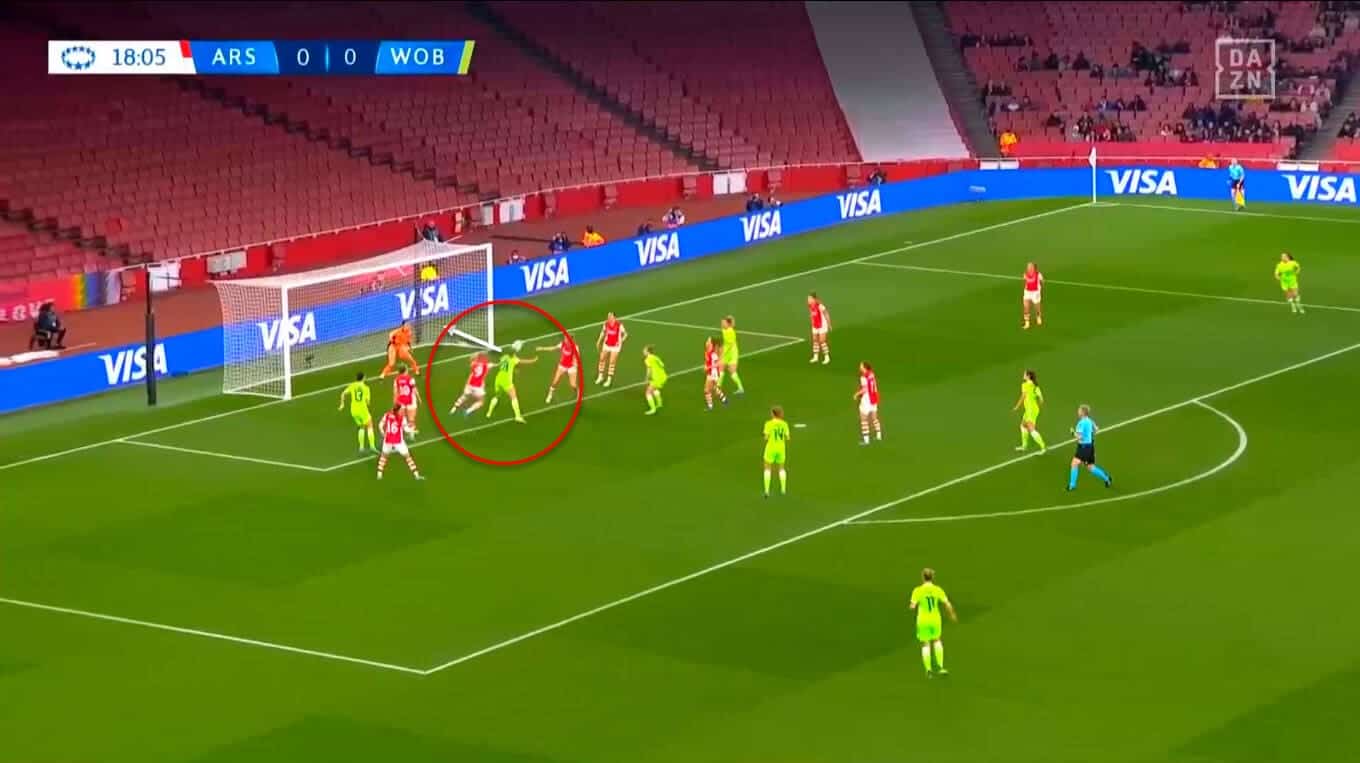 Moreover, Waßmuth can also be useful in the air since she has already scored goals using her headers, especially when playing as a striker and receiving crosses. She did score a header against Arsenal in the UEFA Women’s Champions League after receiving an accurate cross from the right wing and beating her direct marker in order to make an impact on the ball first. Her physical abilities allow her to be even more impactful in duels and especially during such decisive and dangerous situations. Succeeding in improving this aspect would help Waßmuth a lot in the future in terms of numbers since it would give her an additional goalscoring alternative.