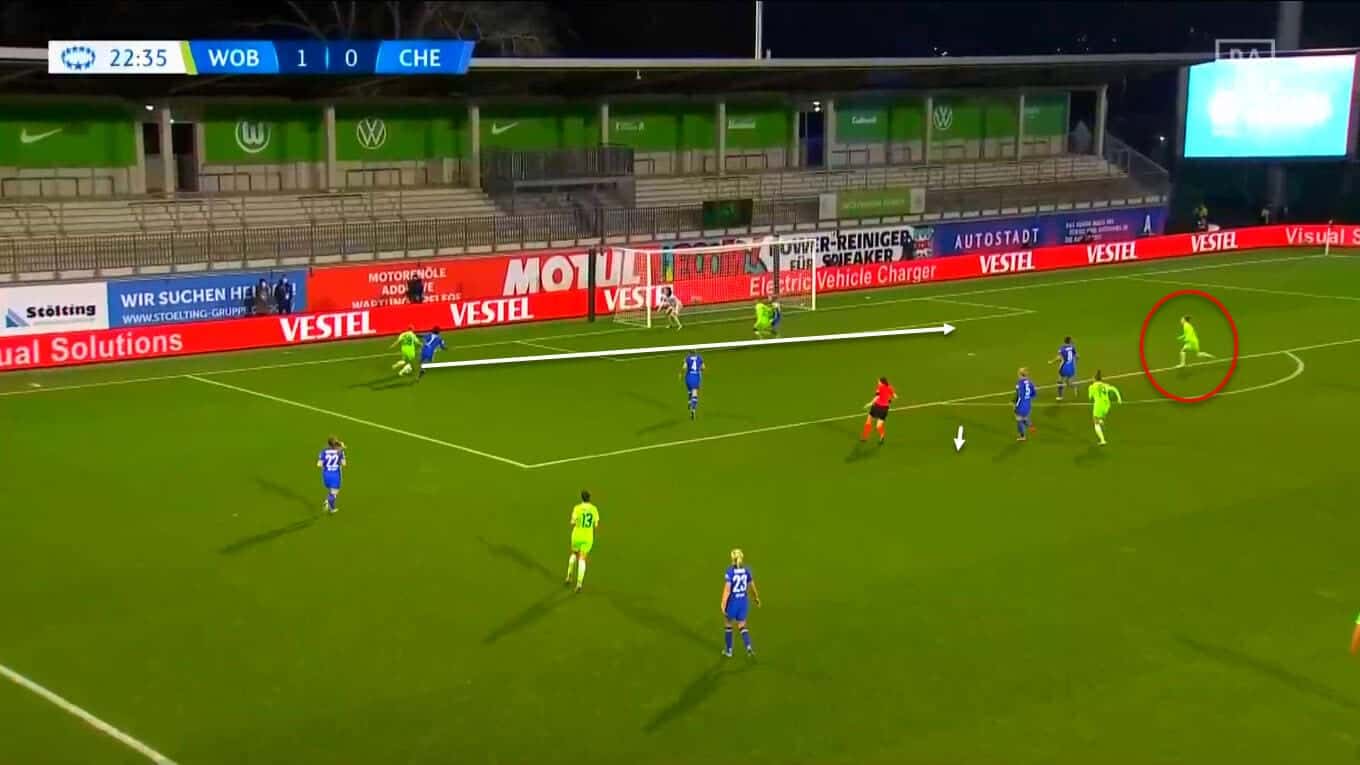In addition to her goalscoring skills and addition to Wolfsburg, Waßmuth is a great playmaker who usually provides accurate passes to teammates even when put in complicated situations. Her ability to use her left foot to provide accurate creative passes as well helps her a lot in remaining dangerous no matter where she is positioned on the pitch. The following goal action against Chelsea highlights Waßmuth’s vision and excellent decision-making during complex situations. She was tightly marked by Jess Carter but despite that, she was still able to advance and cross the ball towards her teammate using her left foot to create a clear goalscoring opportunity almost from scratch. Having the ability to surpass opponents in offensive duels and still provide accurate and key passes helps Wolfsburg a lot in creating and alternating their attacking methods.