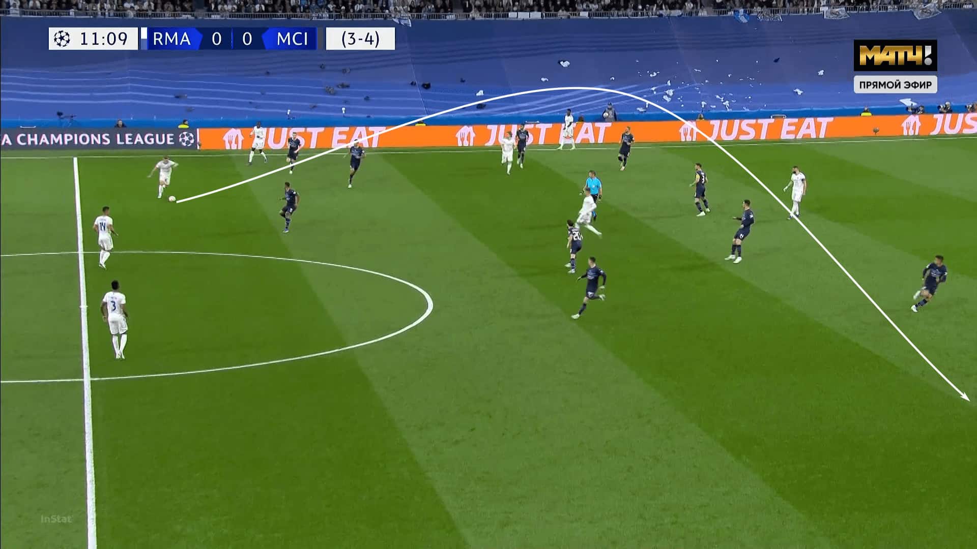 That’s an example of a partial switch as the ball travelled through two vertical channels. In the next sequence, it’s Real Madrid in possession and City that has become unbalanced near the ball. Notice the coverage of the City press. They’re extremely compact, both vertically and horizontally.