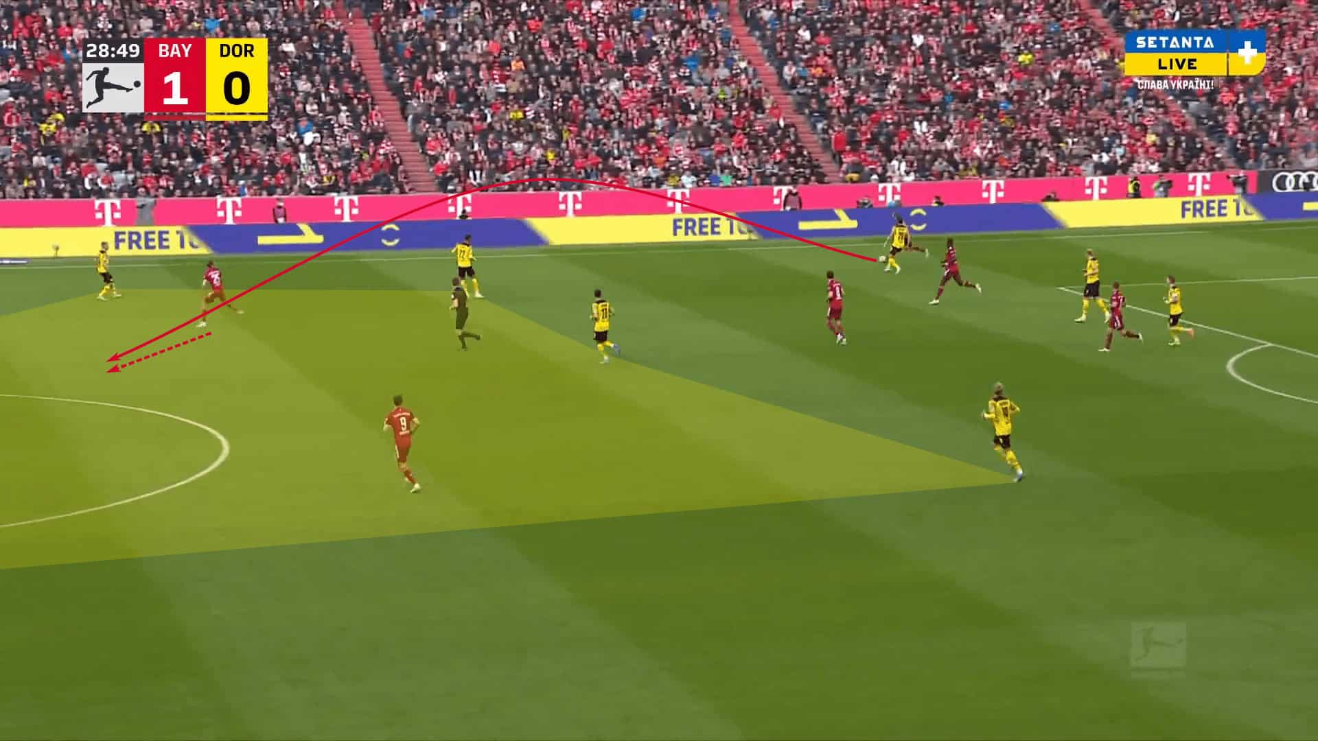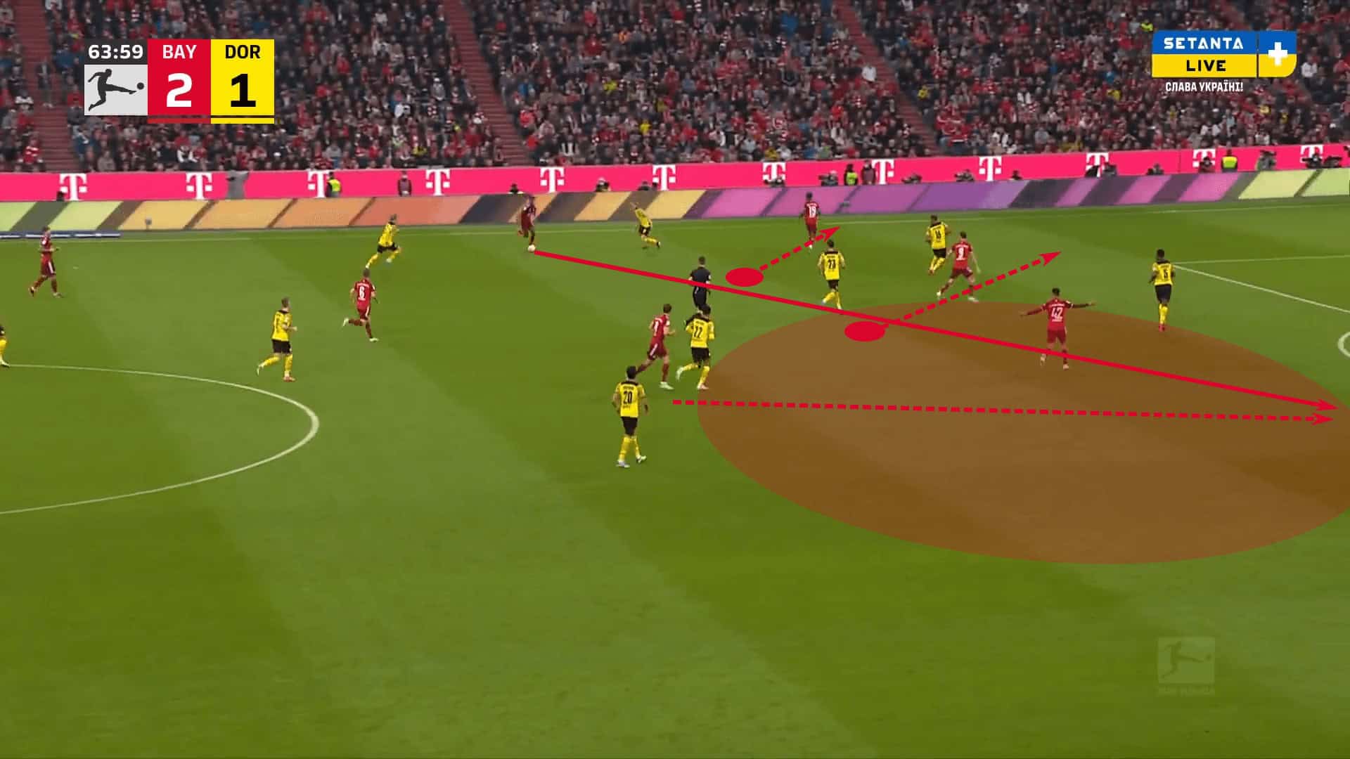 That’s exactly what we see here. The Dortmund defenders track the runners, giving Bayern Munich a lane to move the ball centrally. Rather than the forward, Jamal Musiala, collecting the ball, he dummies it into the path of Leon Goretzka, leading to a blameworthy, unselfish crossing attempt from Thomas Müller.
