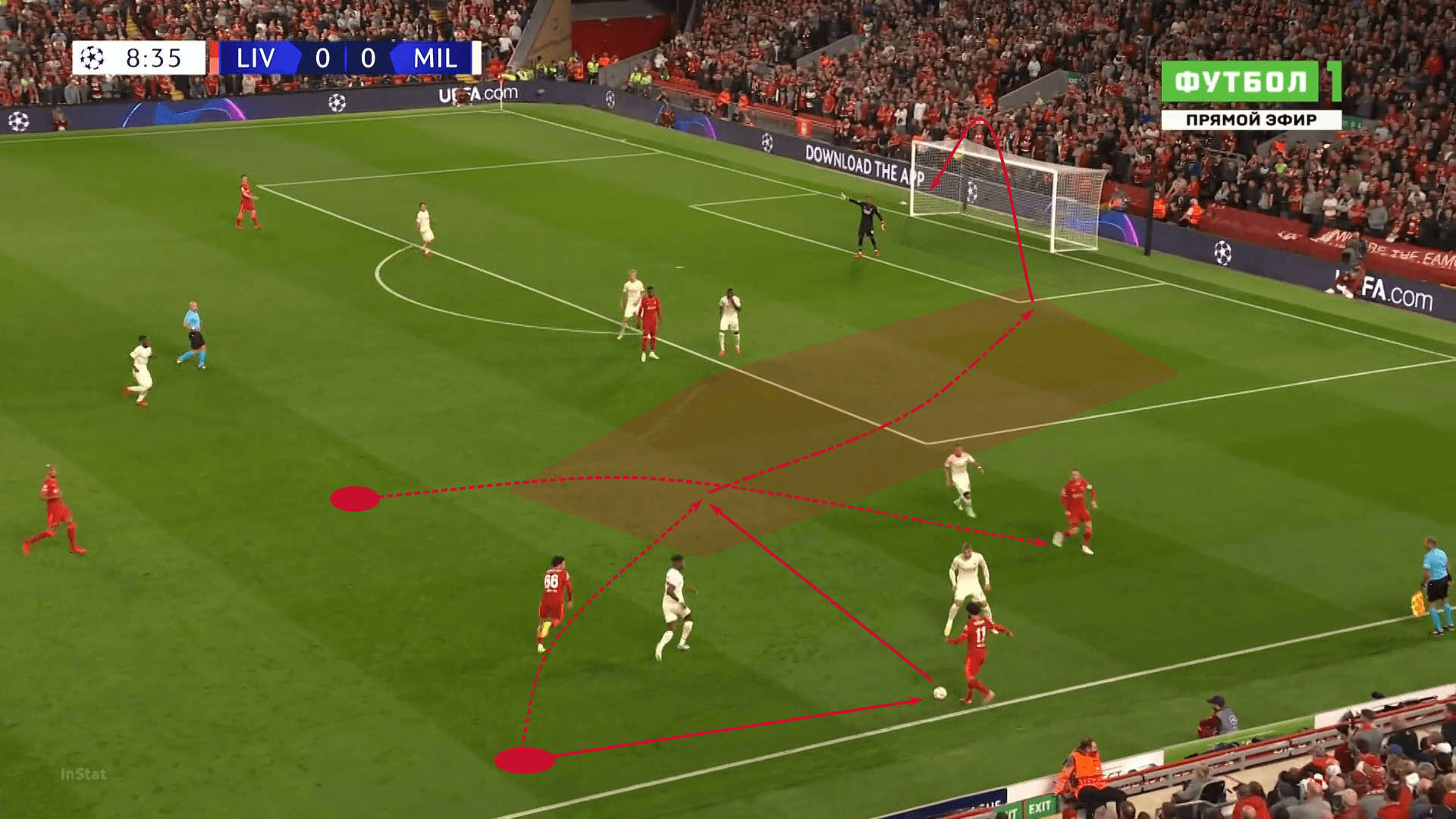 The Liverpool example was fairly simple. Alexander-Arnold offered an angle to play around the AC Milan defence and van Dijk played him. There is very little resistance from Milan as their focus was to deny passes through their lines.
