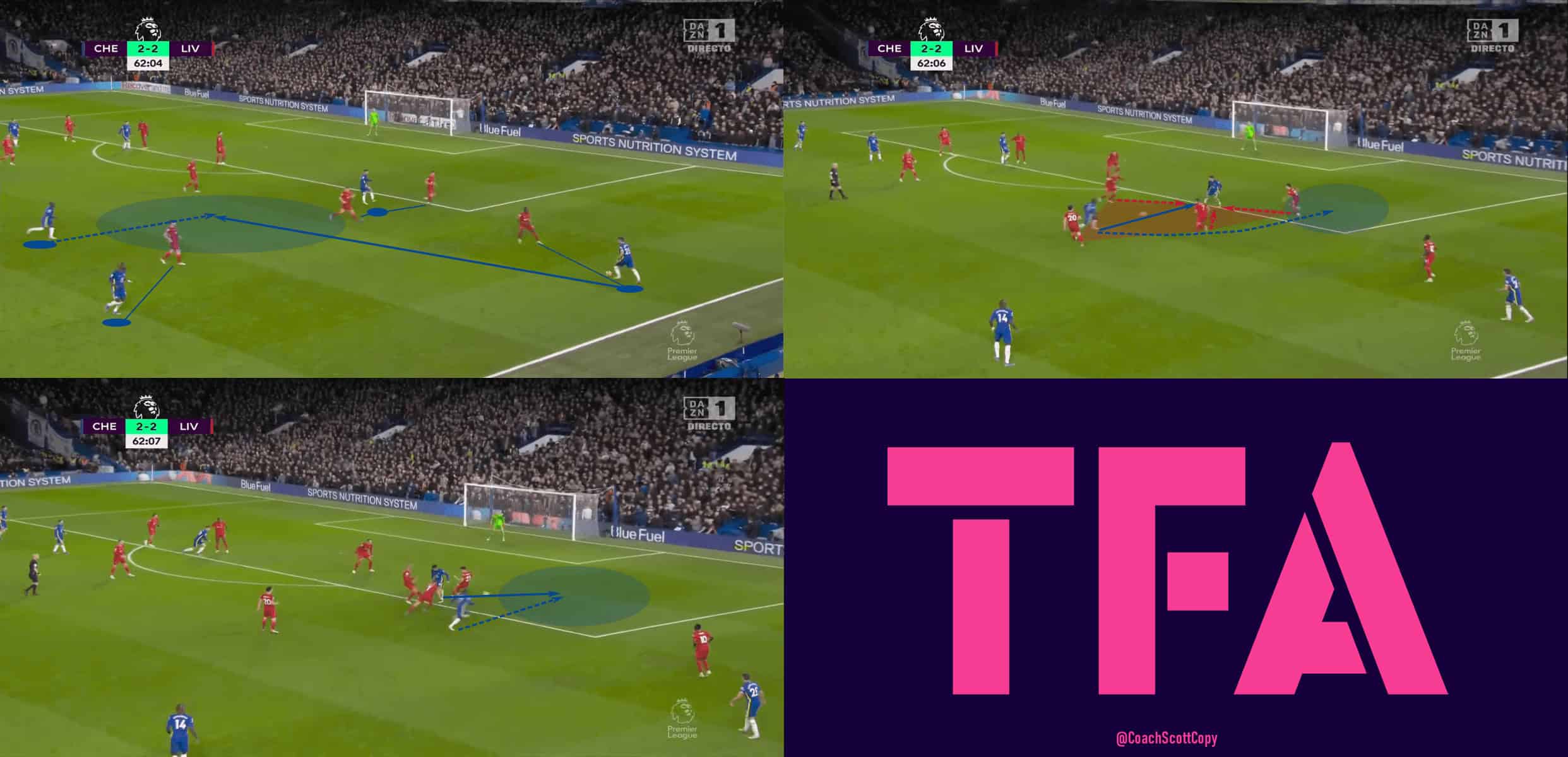 As opponents quickly slide their lines into the wings, Chelsea’s central players are actively searching for gaps in their lines. A pass into the wings offers that mental trigger to search for space centrally.