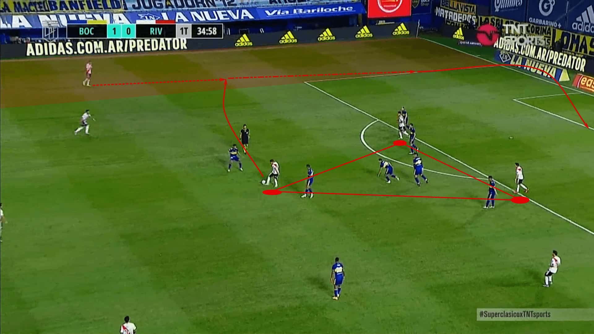 When those forward passing lanes are not readily available, his centre-backs are encouraged to create them. In this instance, dribble progression to pin the Boca Juniors midfield leads to a pass into River Plate’s highest line.