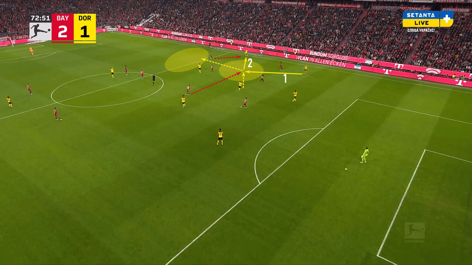 Let’s look at an instance in which the opposition is pressing the build-out more aggressively. In this case, we have Borussia Dortmund in possession and Bayern Munich in the high press.