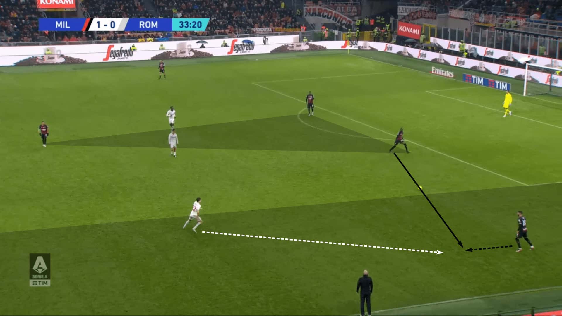 On the flip side, clever managers like Mourinho are masters at funnelling the opponent into the wing and sealing them there. Take this example from Roma. Play was switched and the ball was immediately played forward into the wing. There’s loads of space as the sequence begins.