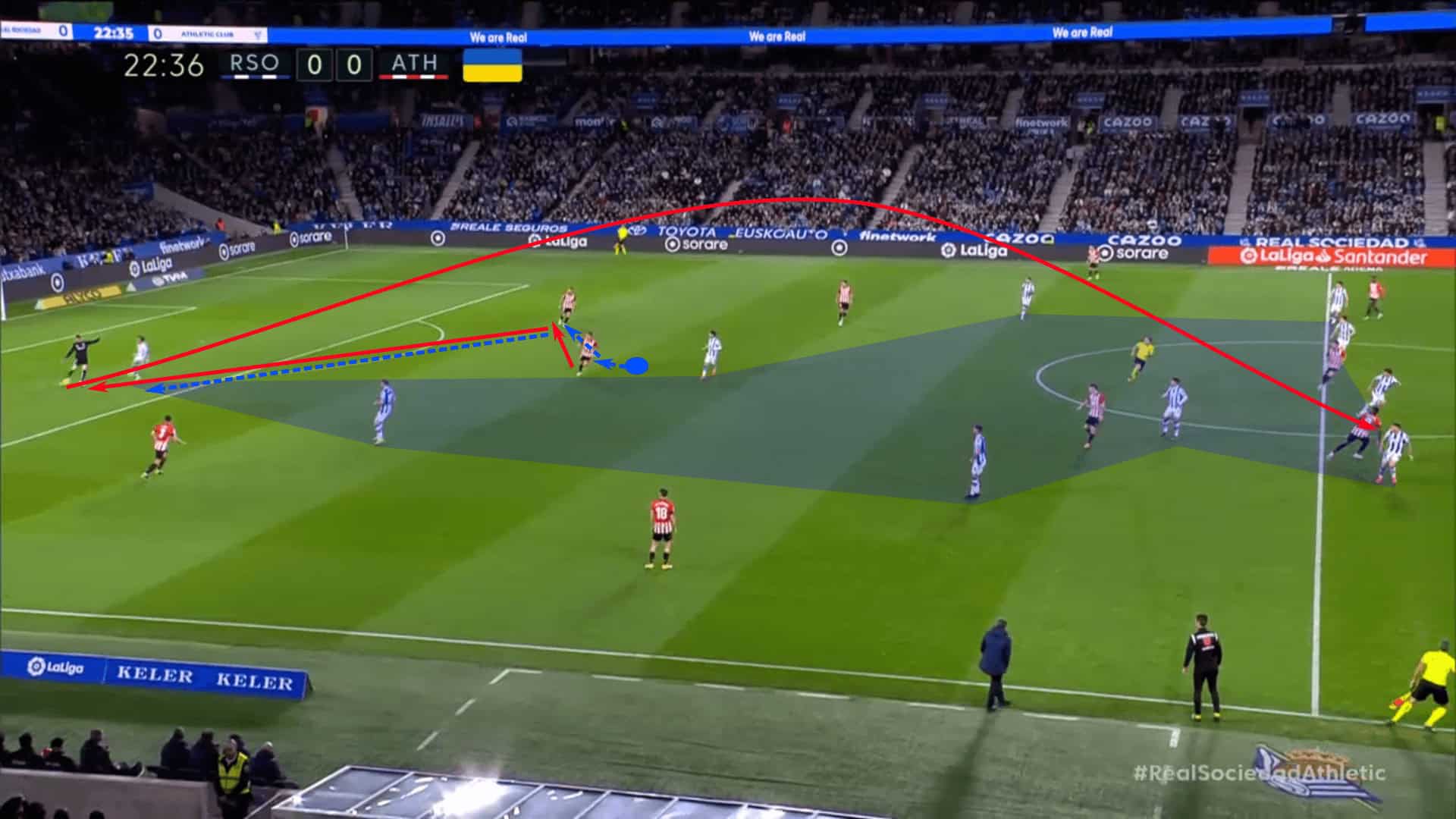 As the goalkeeper plays the past forward, look at Real Sociedad’s defensive shape relative to Athletic Club’s attacking structure. While Athletic Club has several players in wide areas and minimal midfield presence, Real Sociedad is well-positioned to compete for the first ball and collect the second. That’s exactly what happens. They win the first and the second.