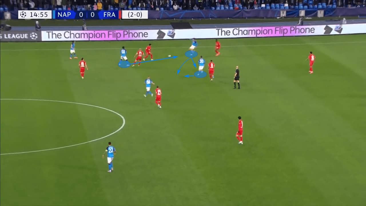 Regardless, Zambo Anguissa chooses to find Kvaratskhelia who immediately plays a tabela – or one-two – with Zieliński to get out of that area, leaving four opposition players behind.