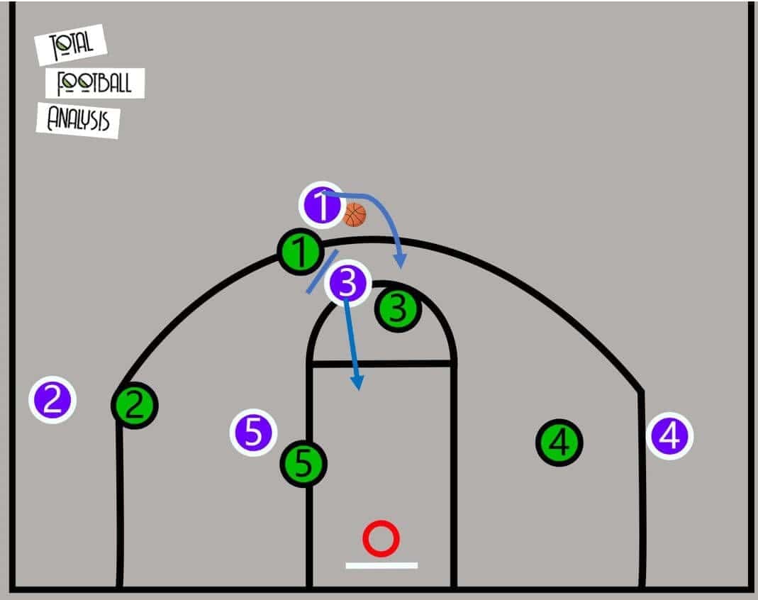 The pick and roll, along with its multiple variations, is a common way for basketball sides to create overloads and find space to drive to the basket. A pick and roll is simply one player setting a screen by moving forwards (pick) for the ball carrier, before then moving (rolling) towards the basket. We can see an example of this here. The small forward (three) moves forward and occupies the man marking the ball carrier. As they move forwards, they are also followed by their marker. The small forward screens the on-ball defender, while the ball carrier then moves around the screen with the ball, now occupying the screener’s (pickers) marker. Therefore, once the player has set the pick, they can move forward unmarked, thus creating a numerical advantage as the initial on ball defender is rendered useless on the play.
