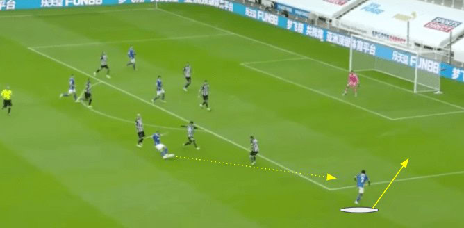 He impressively gave Allan Saint-Maximin the run round only for the Frenchman to cut the Brighton youngster to the ground, resulting in a penalty which was converted. Lamptey’s dribbling ability was well showcased to win the penalty, taking up a wide position and coming inside, as shown in the image below.