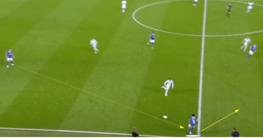 When Brighton have possession of the ball, he takes up a high, wide position to offer an option to his teammates at centre-back and midfield to find him. In the image below, we can see this typical positioning that Lamptey likes to take up. The centre-back is able to find him in space with a pass that breaks the first opposition line of defence.
