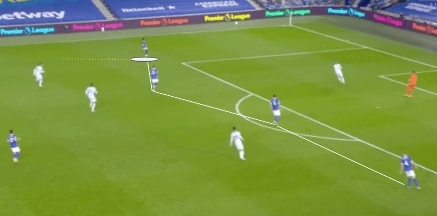 The image below shows a typical position that Lamptey likes to take up when Brighton are on the attack. By playing high and wide, he is able to find space in a dangerous offensive position, as seen below.