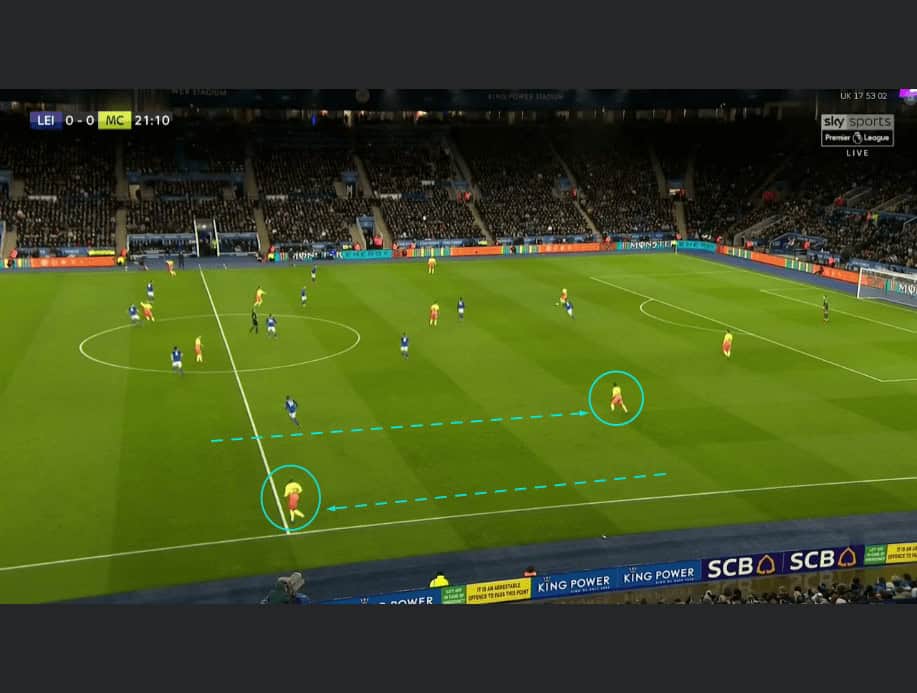 As width is essential in Guardiola’s philosophy, the winger provides this on the far side for City, with Riyad Mahrez providing this in this example.