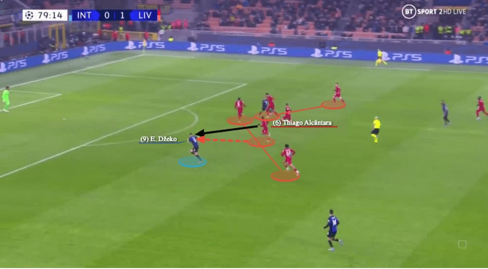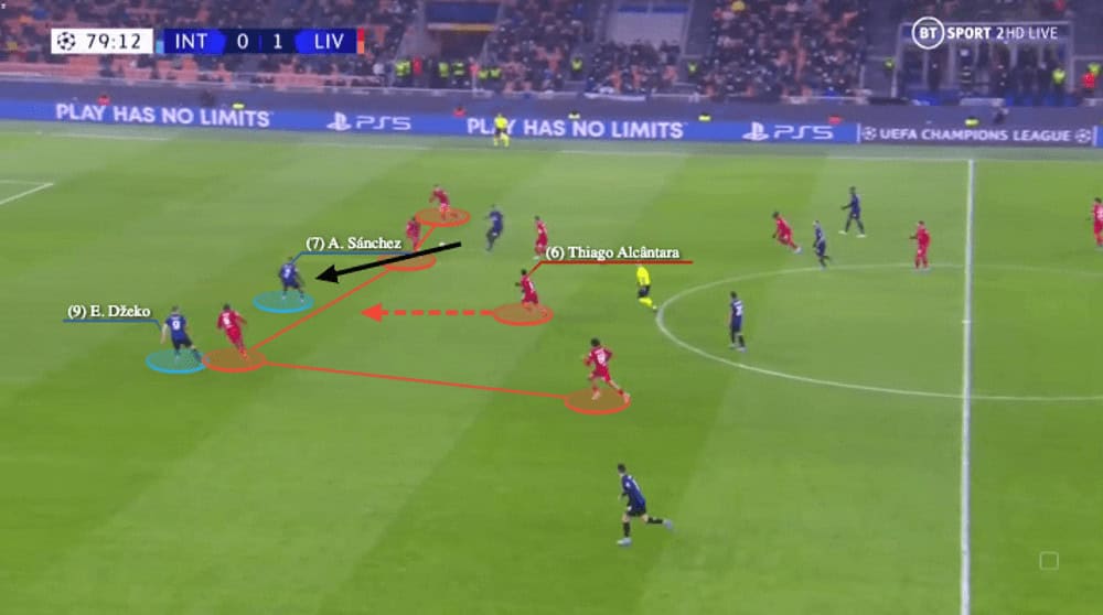 The answer was very clear just two seconds later, as Thiago saw both centre-backs were going for Sánchez, he knew the danger would not be there. Instead, since Ibrahima Konaté jumped, Edin Džeko was now without marking and Sánchez managed to connect the Bosnian striker with a pass. Because Thiago was calmly seeing everything and made good judgements, he tracked back to a good position to intercept that pass to prevent Inter from reaching the penalty zone, helping his side to secure a clean sheet.