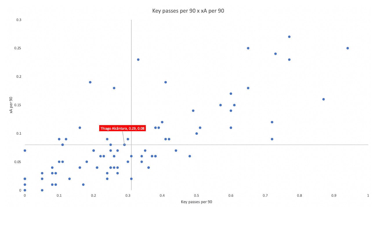 Speaking about a Spanish 8 who could slice good passes in a 4-1-2-3 system, maybe people thought Thiago would be doing things like David Silva — creating chances for his side. But Thiago is not in that same exact mould, as he only has 0.29 key passes per 90, below the average, and 0.08 xA per 90 which just about hits the mean. We should bear in mind that these numbers were just giving us an impression of the playing style of the player, as we are going to explain next, Thiago might not be impressive in these two metrics because he was playing quite deep for his side.