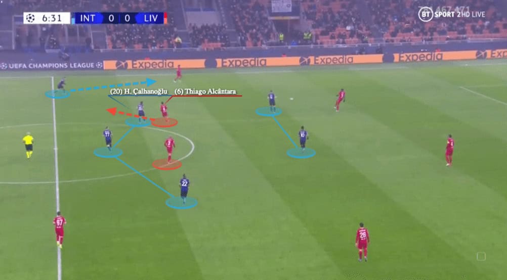 Here came the good decision, as Thiago immediately changed his mind and decided to drop back to give Alexander-Arnold a lateral passing option, so if Çalhanoğlu followed, Diogo Jota could be free to receive. Or, alternatively, if Çalhanoğlu covered Jota in the midfield line, Thiago would find himself free beside his right-back.