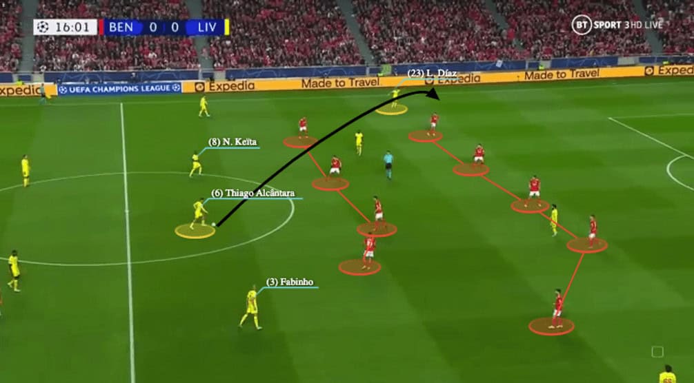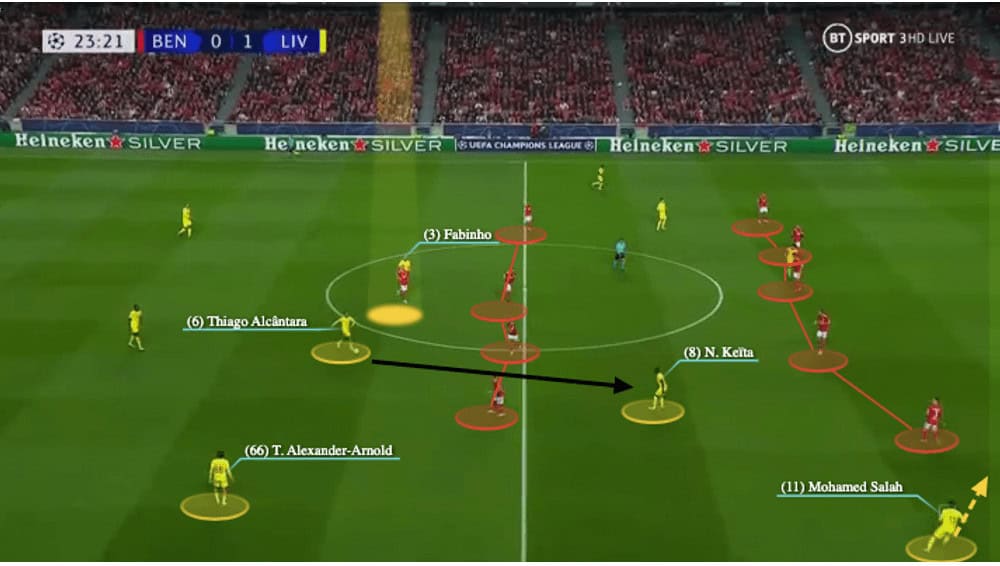 Here, against Benfica, when the opponent designed a defensive system with a striker man-marking the 6 (Fabinho), Thiago’s presence in the midfield would be pivotal to connect play. Here, he was able to receive in the parallel zone with Fabinho, but the striker could not close him.