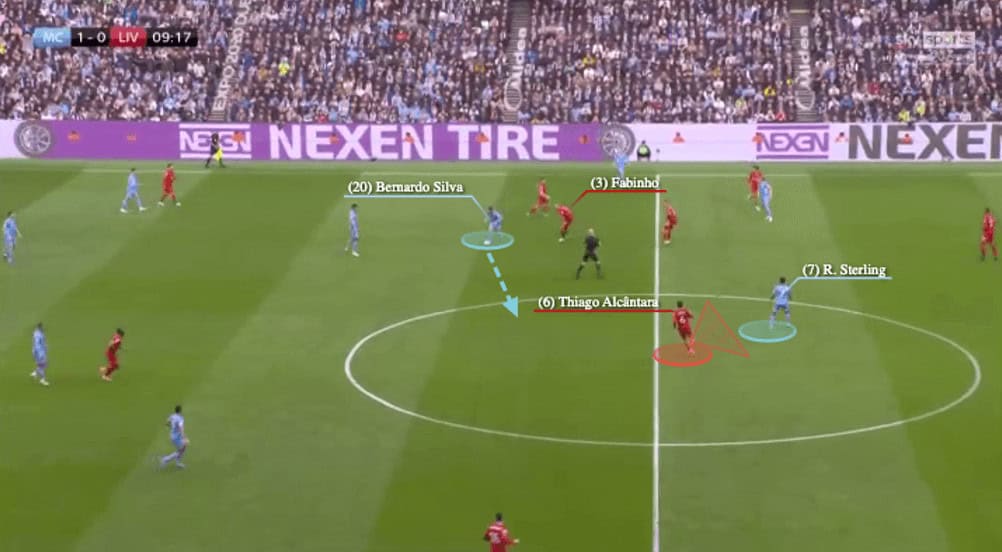 And you could see the positives after Thiago decided to stay in that space, he was in control in that area, achieving several objectives, such as closing Sterling’s space with Virgil van Dijk or blocking Silva’s passing channel to Sterling.