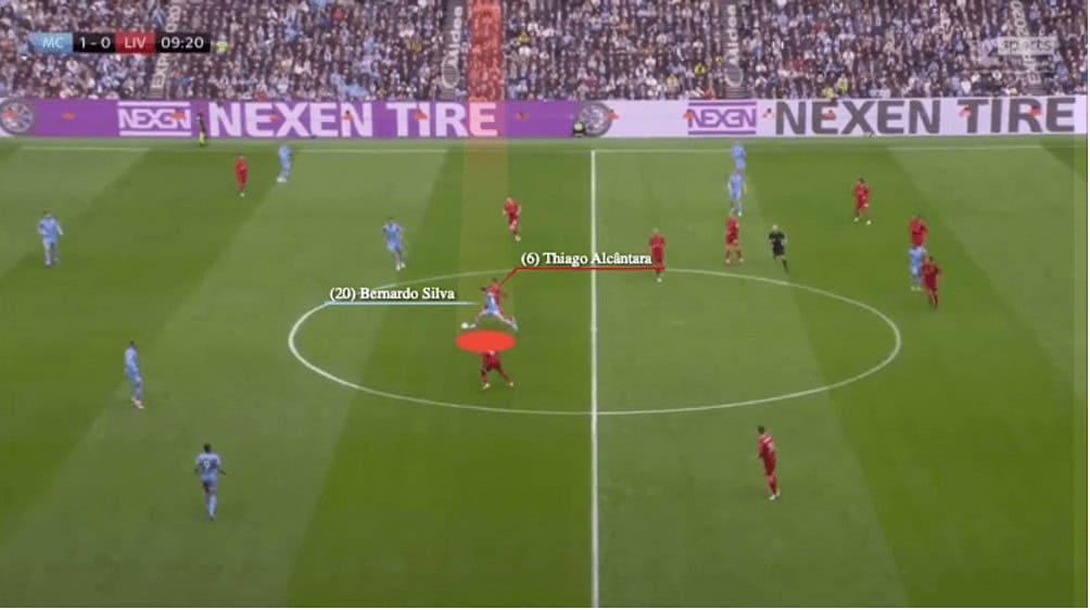 Because of Thiago’s good positioning, Silva could not pass, he was forced to further carry the ball but that turned out to be an occasion when Thiago came out to press. You could see in that image when Thiago made the challenge, the angle was good and he made clear contact with the ball, stealing it from a technically great player.