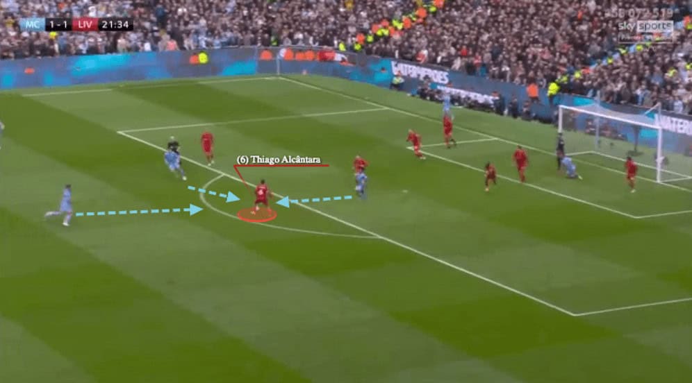 In the first image of the section, City recovered the ball and now Fabinho was not in the centre, Thiago was moving back to the centre, the first reaction was good because he had the mindset to defend.