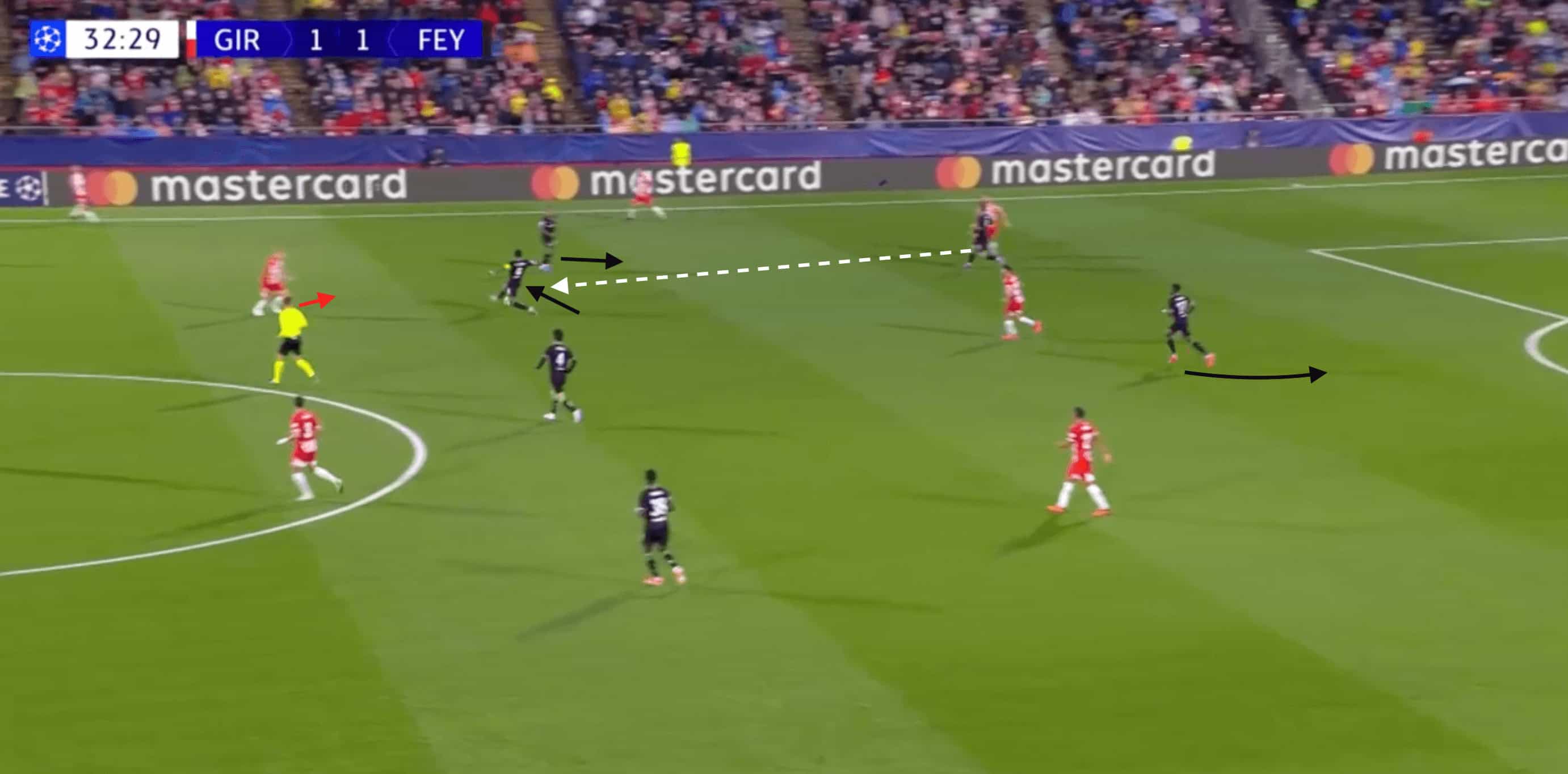 Incorporating Donny van de Beek’s lateral movement as that floating ‘number 10’, Girona was able to craft an impressive attacking move that seemed to catch the French champions on their heels, with impactful runners behind.