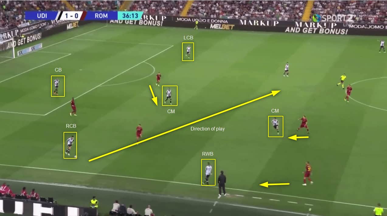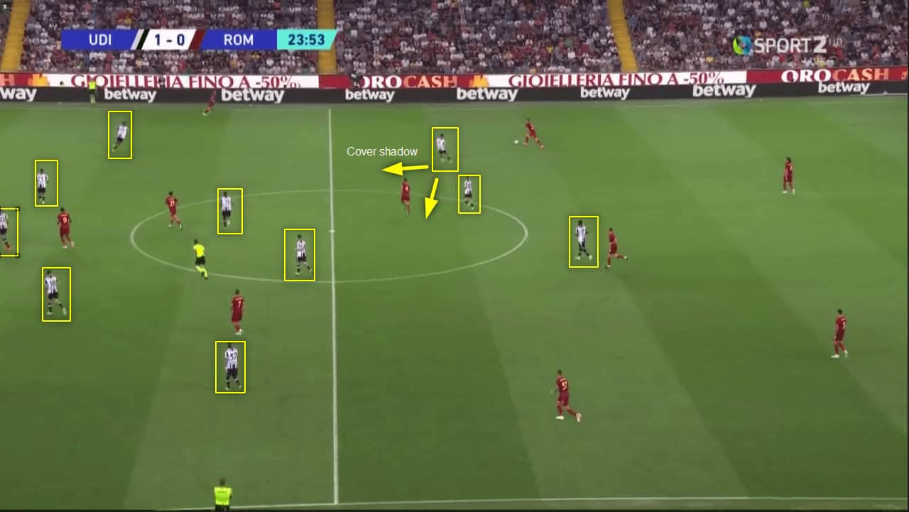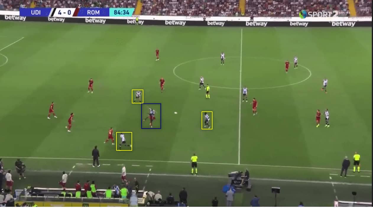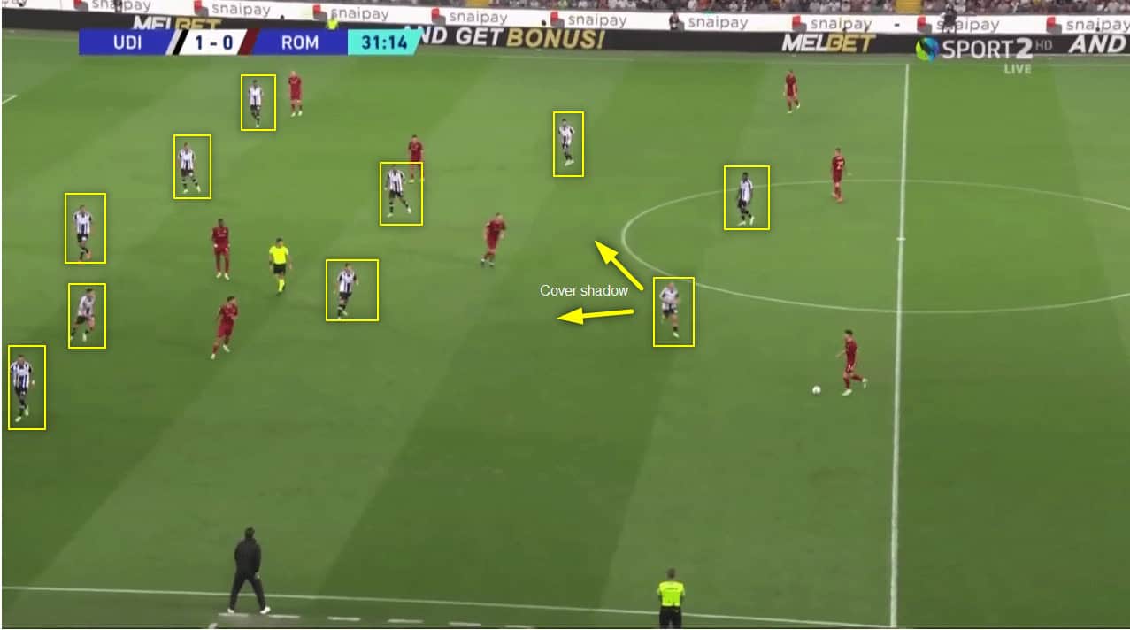As you can see, Roma’s centre-back Ibañez cannot make that pass into Cristante because of Udinese’s defensive positioning.