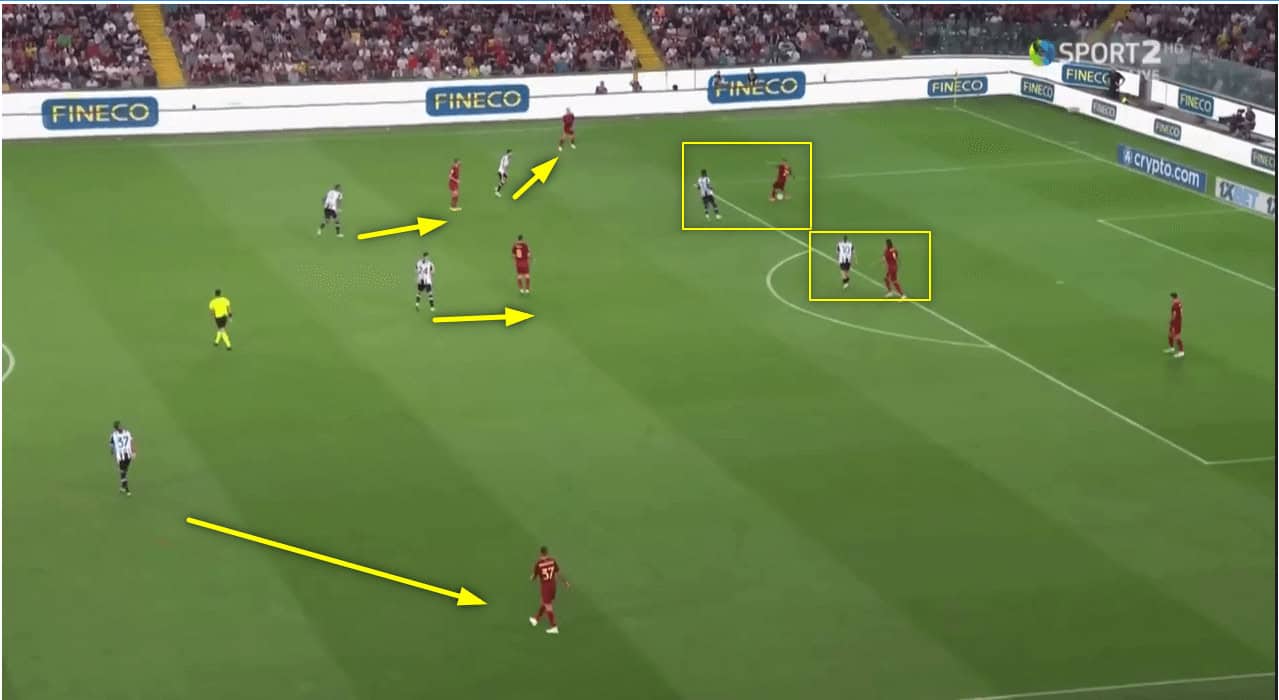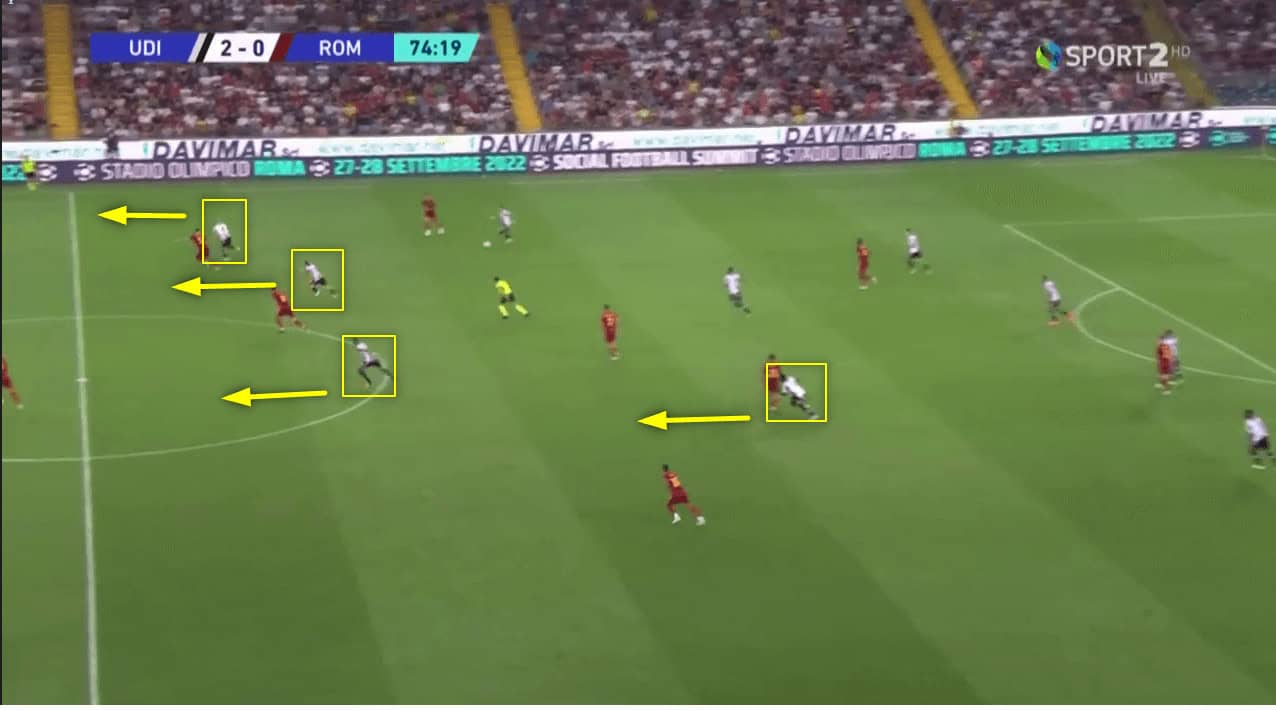 So, Udinese looks to apply a man-to-man pressing system and control the space. This example shows how the team from Friuli-Venezia Giulia box Roma into a specific area, the only way José Mourinho’s men get out in this situation is by playing a long or conceding possession