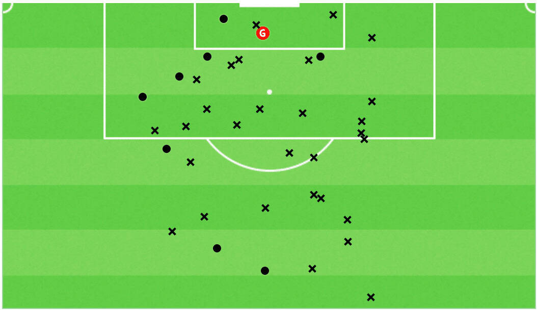 In the eleven international fixtures Belgium have played in 2021/22, they’ve conceded 6 goals from an xGA of 8.7. The figure below shows the locations of 38 non-penalty shots conceded by Serneels’ side in their last five fixtures. Shots on target are marked by a black dot, while shots off target or blocked are marked with a black cross. Belgium have only conceded one non-penalty goal (NPG) in their last five games, with that NPG coming from a long Kosovo free-kick into the box that was controlled and finished.