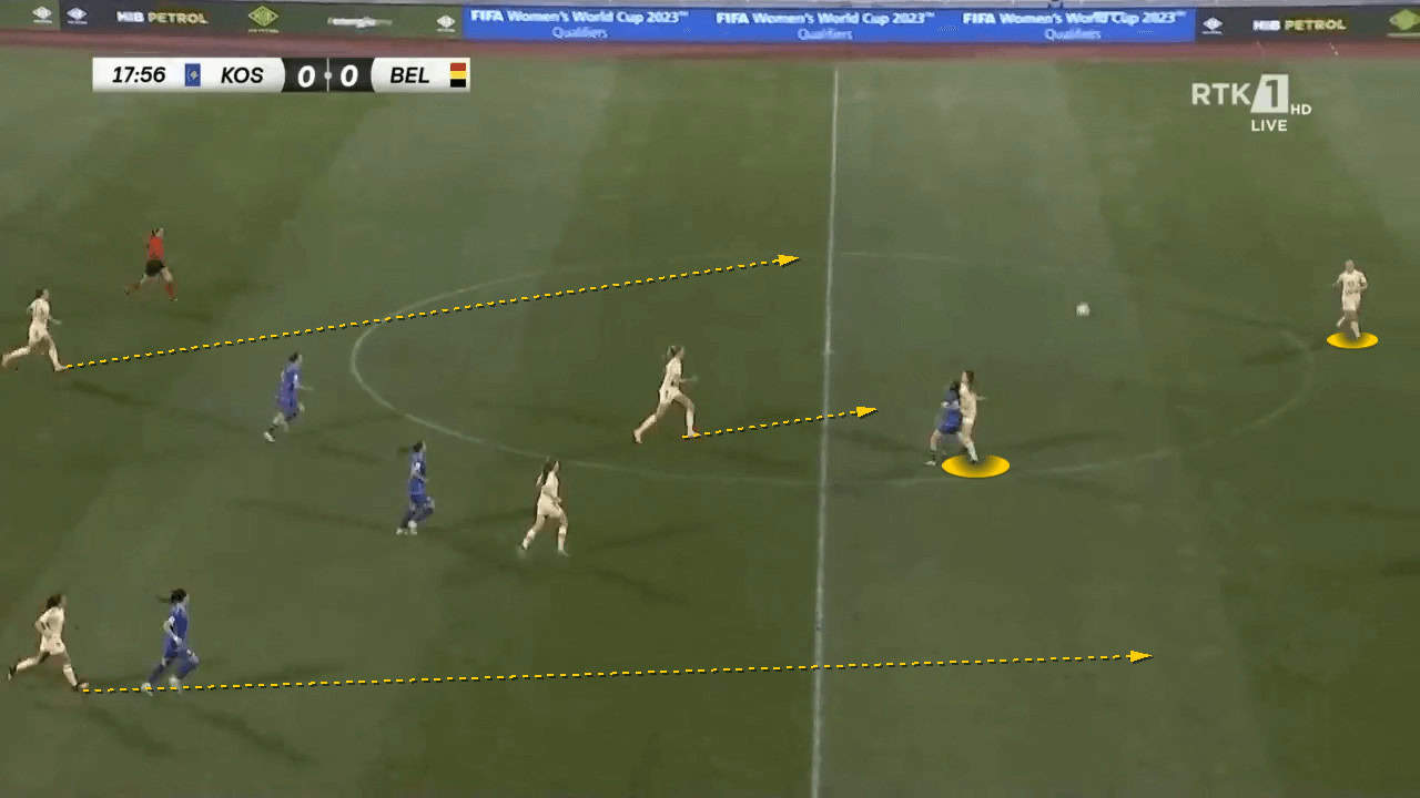 Due to their narrow out-of-possession shape, Belgium’s direct counter-attacks tend to be central; the Red Flames will typically attempt to pass up towards the striker within two passes of the regain.