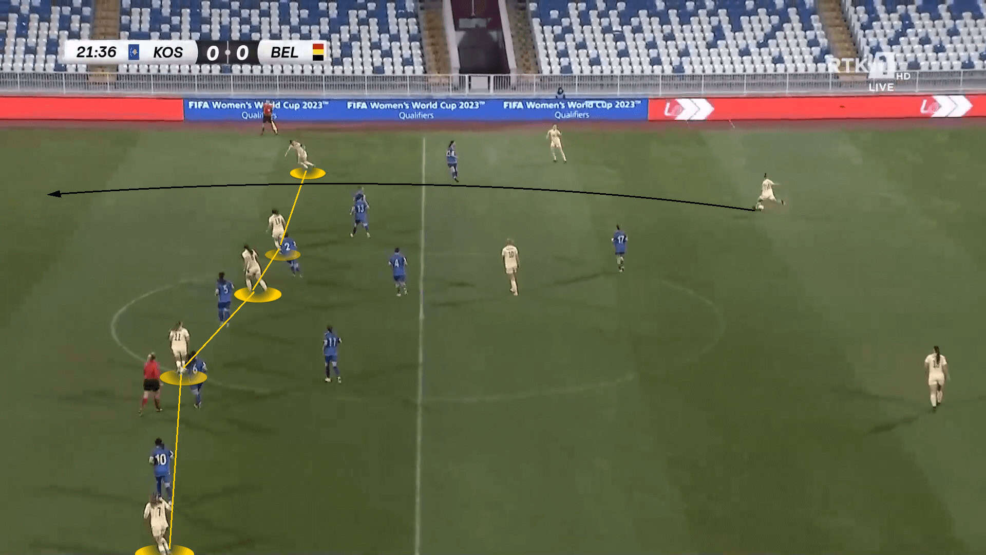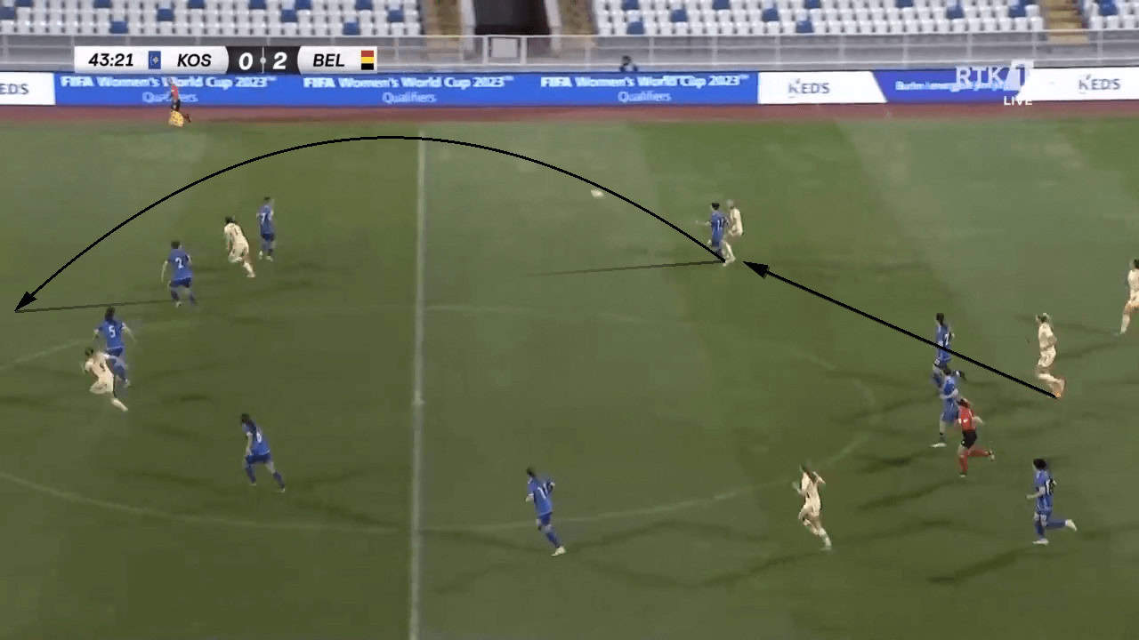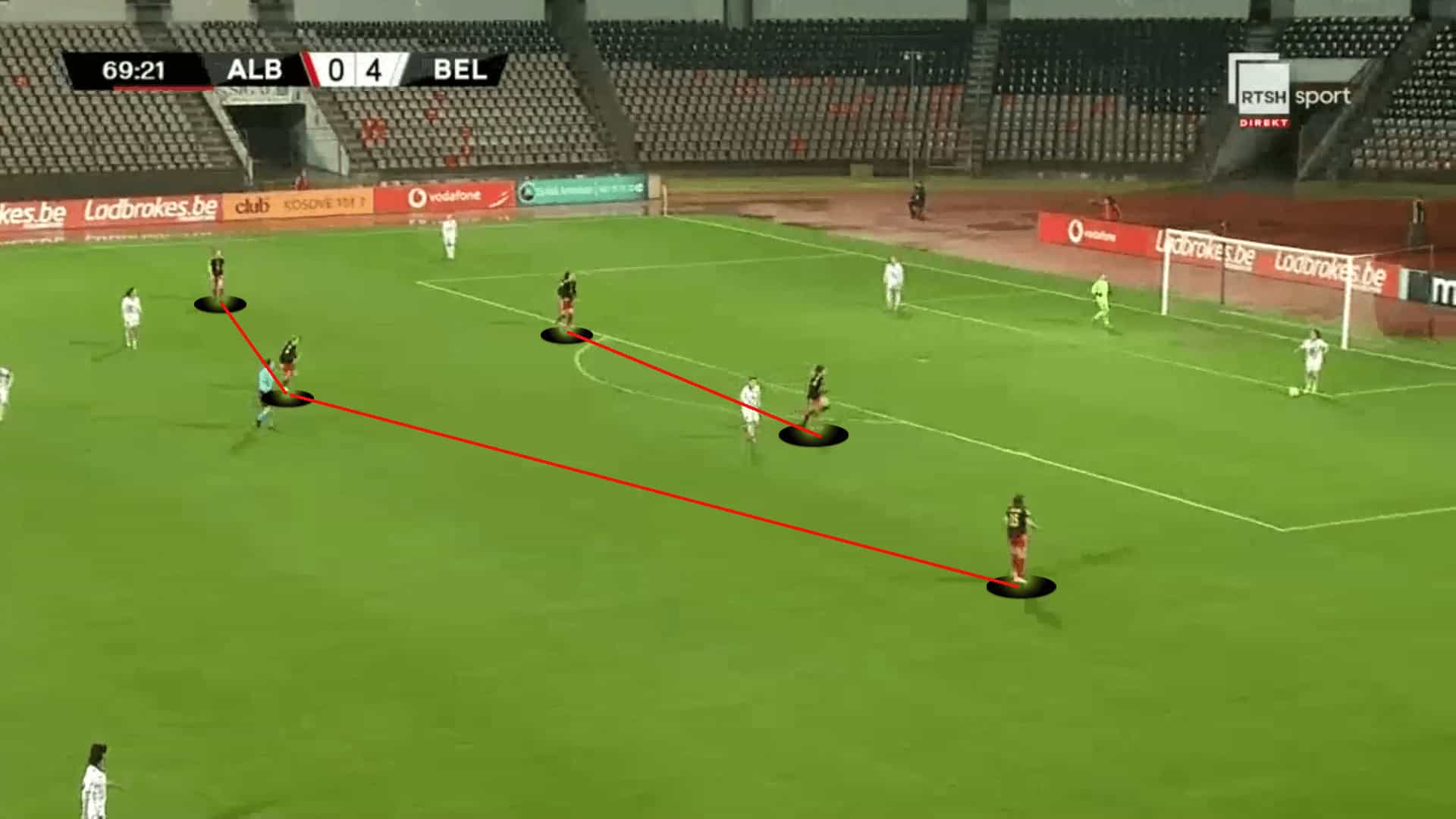 Here is an example of Belgium operating with a front five to successfully overload Kosovo. Despite having every player behind the ball, the overload has perturbed the Kosovan defensive structure and allowed Belgium to penetrate in behind on the right-wing via a centre-back’s through ball. It is common for Belgium to attempt through balls due to their forward’s tendencies to sit on the shoulder of the defender to run in behind. Often, the strikers will start in an offside position before dropping back onside to perfectly time their run in behind. This strategy can lead to lots of offsides, but correct timing of runs from Eurlings and Wullaert particularly creates clear-cut chances.