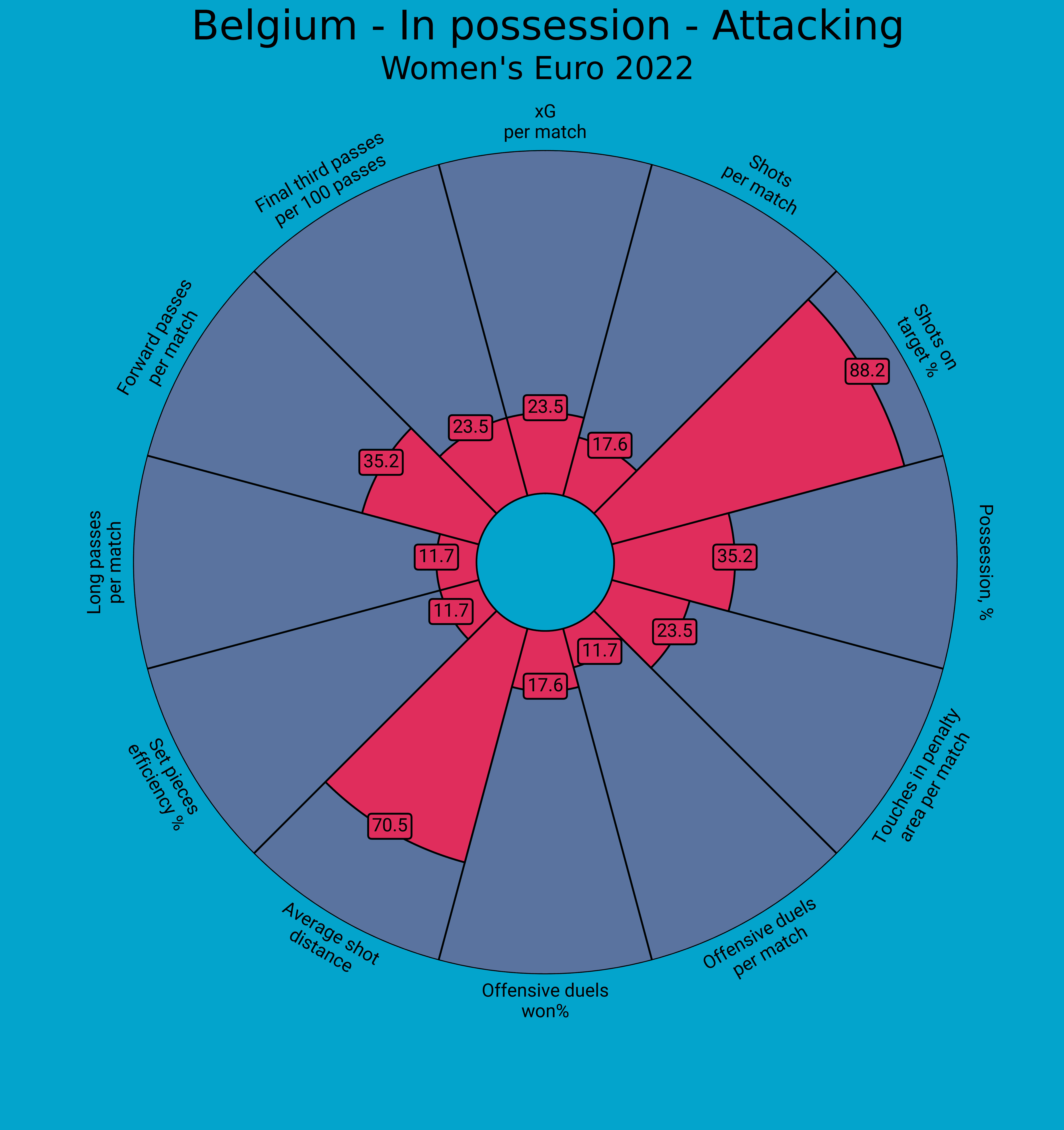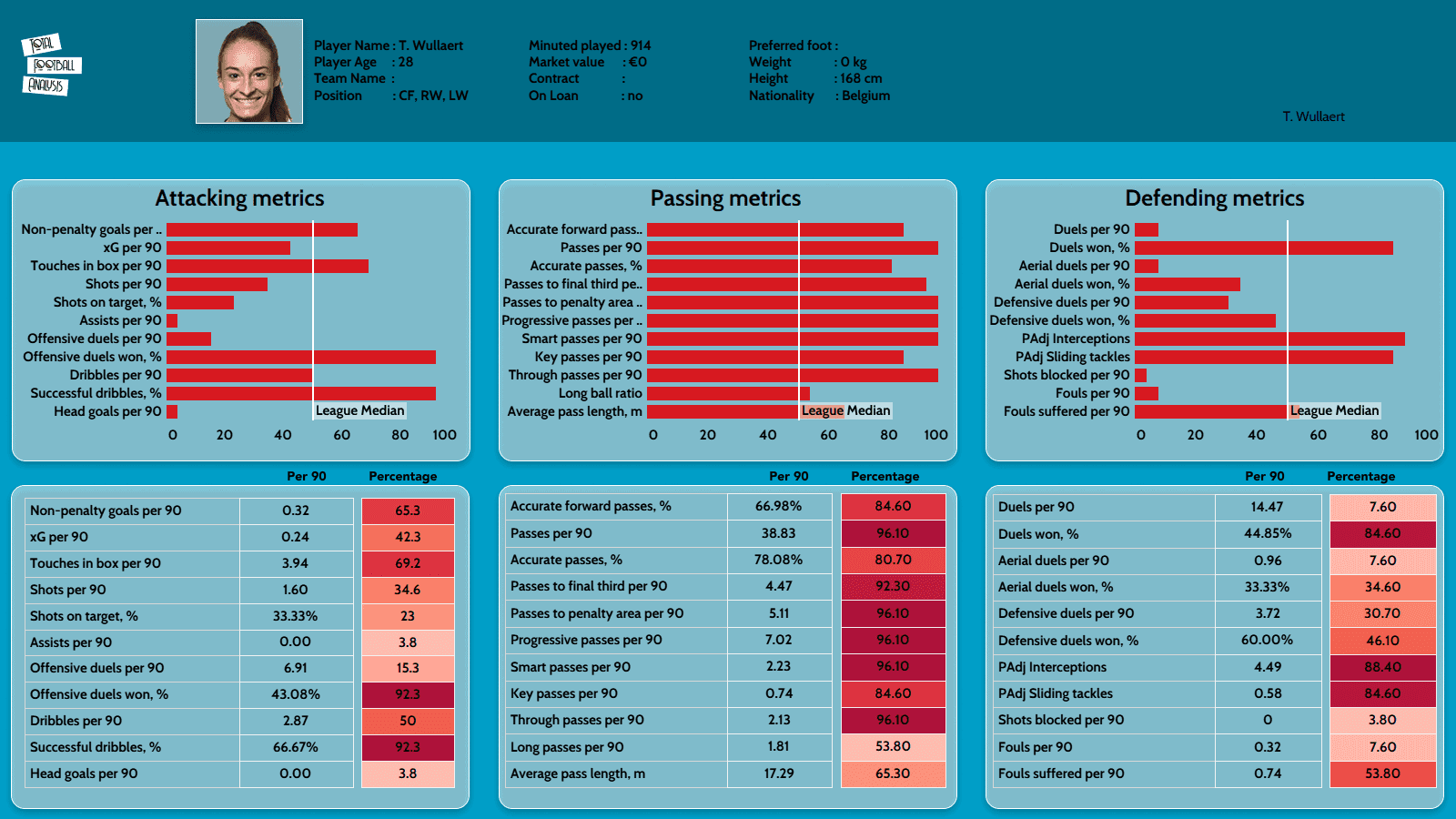 The image here breaks down her domestic performances for the last calendar year and compares her statistics in each noted area with the league median. Notching up 15 goals and 10 assists for Belgium this season, Tessa Wullaert is remarkably averaging a goal involvement every 30 minutes. Essential to the Red Flames’ attacking play, she is the best finisher and creator in the squad and will be vital to Belgium’s attempts of getting out of the group stage.