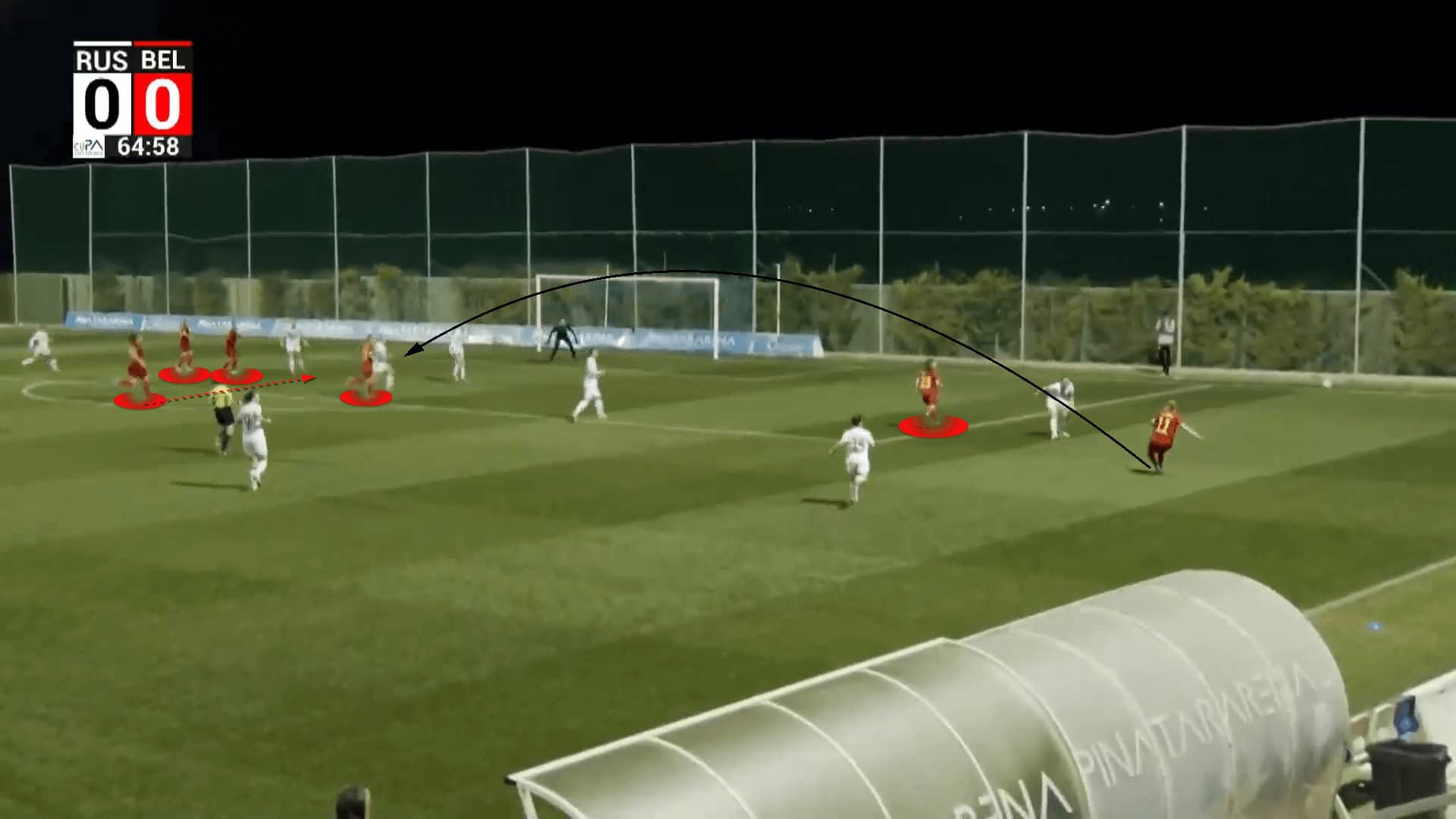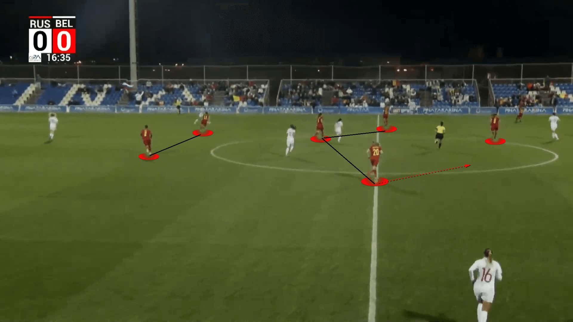 The figure below is an example of this against Russia in the 2022 Pinatar Cup final. As the ball moves into the widest channel, the right-winger begins to move wider, with Belgium’s left-winger dropping deeper into the midfield.