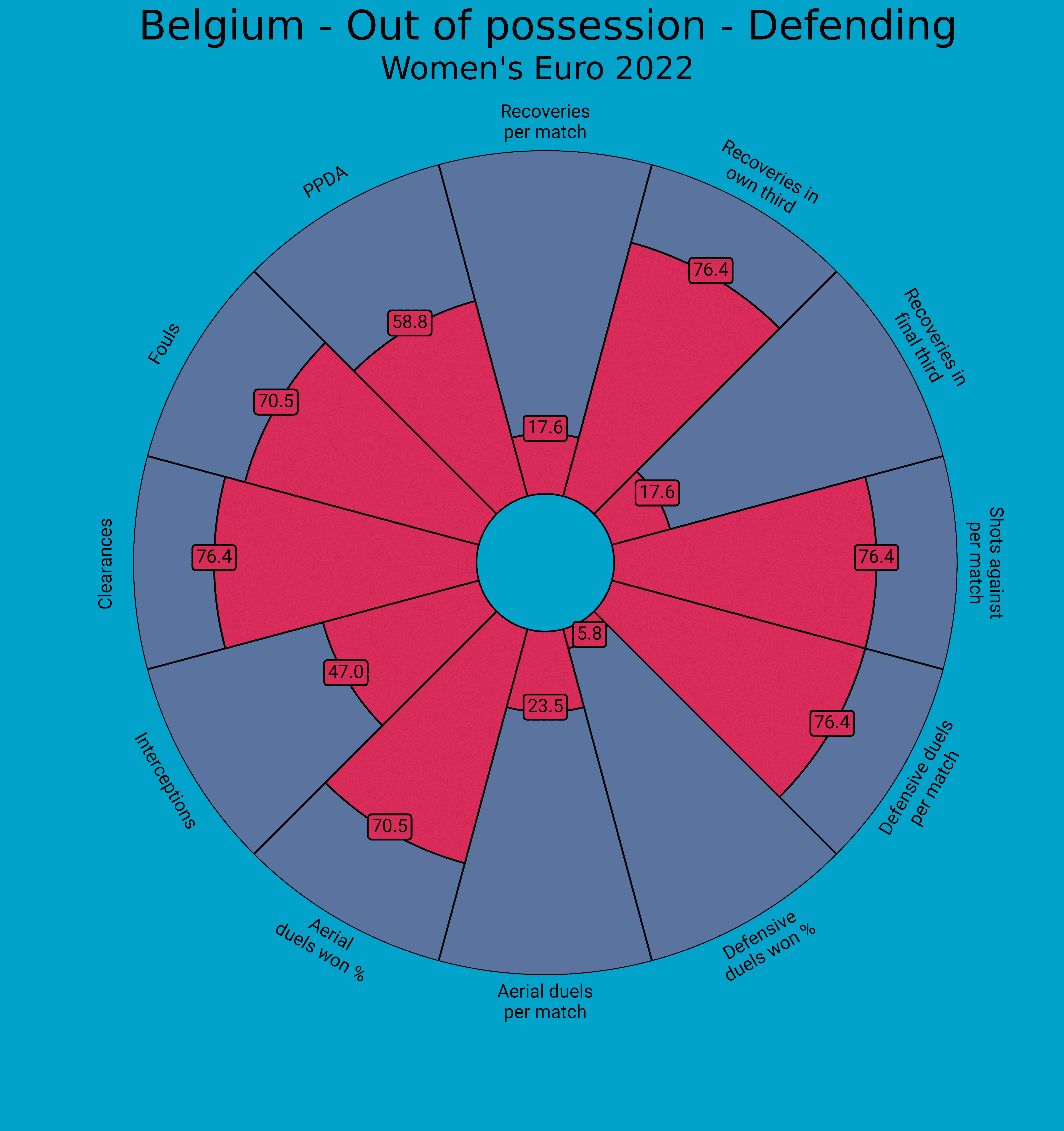 We can see that most of the shots on target conceded by Belgium are located on the right side of their defence. However, right centre-back Amber Tysiak missed some games through injury, meaning the defence was rotated and even included midfielders at centre-back in the latter stages of games, so perhaps this was deliberately targeted by their opposition. A potential weakness to Belgium’s defence that could potentially be targeted at the Euros is their defending at the back post, although their overall aerial duel success is adequate.