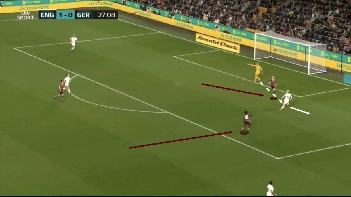 Similar to when discussing their pressing tactics, it’s important that Germany’s midfielders, in particular, possess good spatial awareness, decision-making and physical traits as the opposition begin to break through the centre. Generally, Voss-Tecklenburg wants her team counter-pressing with high intensity and to defend aggressively to win the ball as far up the pitch — and away from their own goal — as possible. On this occasion in our example, the opposition have managed to cut through Germany’s midfield again as the press didn’t close the opposition down enough and ultimately gave them too much space to play with, leaving forward passing options in too much space which allowed the opposition to progress. If teams can expose Germany in transition like this during the summer should the Germans not counter-press effectively enough, which is certainly a possibility and something we’ve seen at times, then this will be a weakness in their game.
