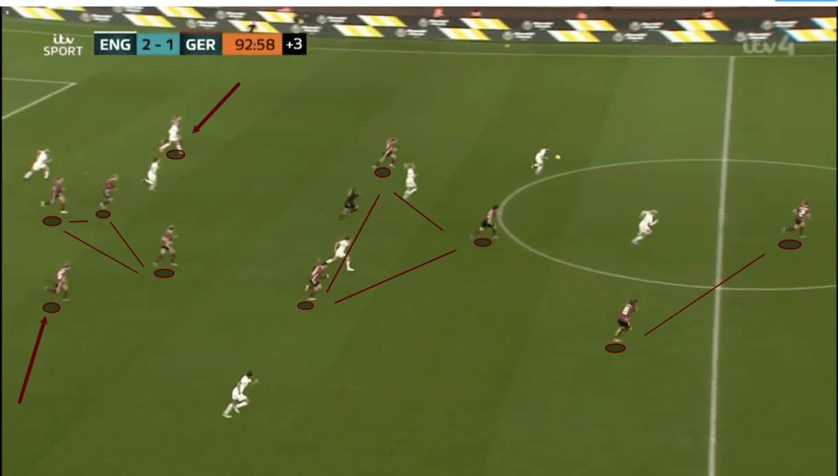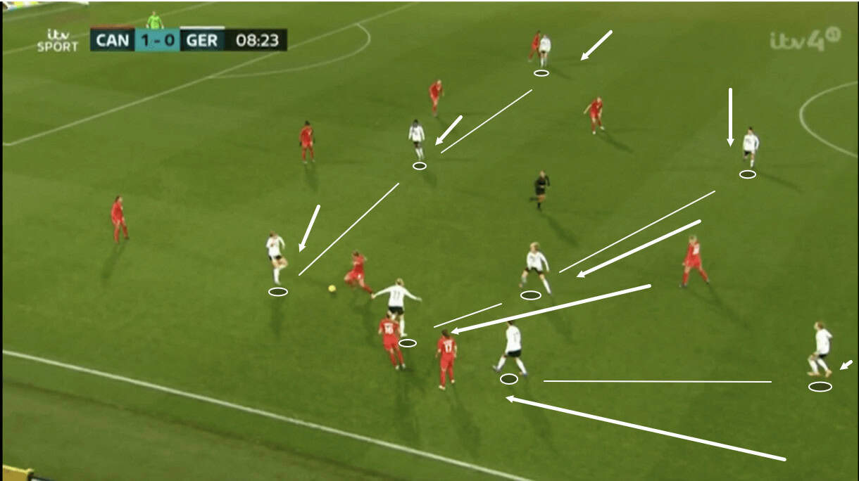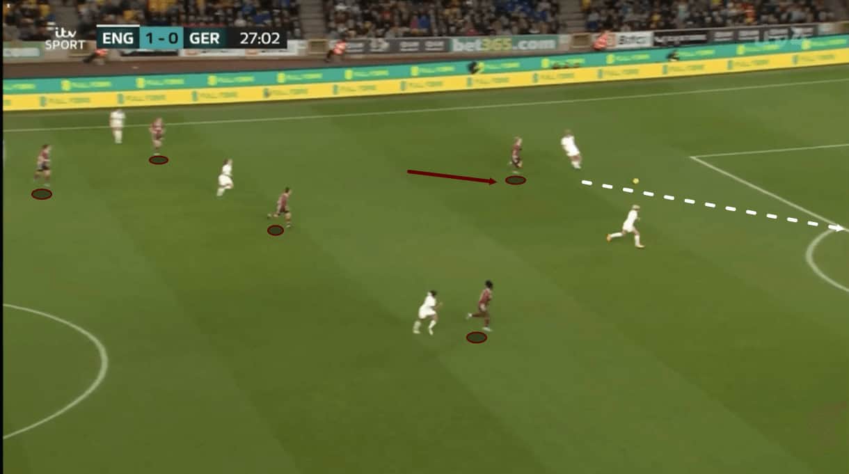 As the ball makes its way back to the opposition’s keeper, Germany’s centre-forward has a crucial role to play. She must jump immediately to close the ‘keeper down, yes, but also to close the passing lanes to the opposite wing and prevent the ‘keeper from turning out to avail of the potential switch of play. If the goalkeeper is allowed to turn out here, it’d be disastrous for Germany as they have their players oriented to the left-wing right now. As a result, it’s crucial that they keep the pitch cut in half and keep the opposition enclosed on this wing, which the centre-forward manages to achieve here as she presses quickly and more importantly intelligently to cut the passing lanes to the right and make it impossible for the ‘keeper to turn out without showing too much of the ball to the centre-forward.