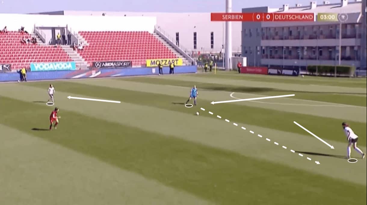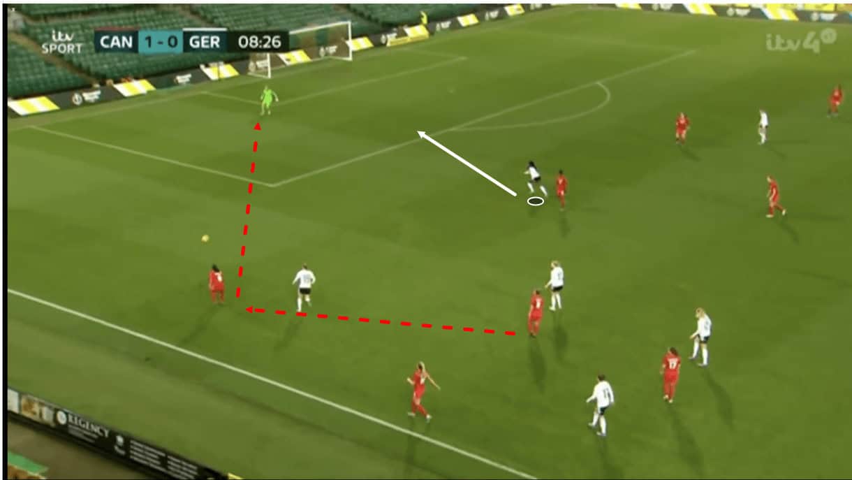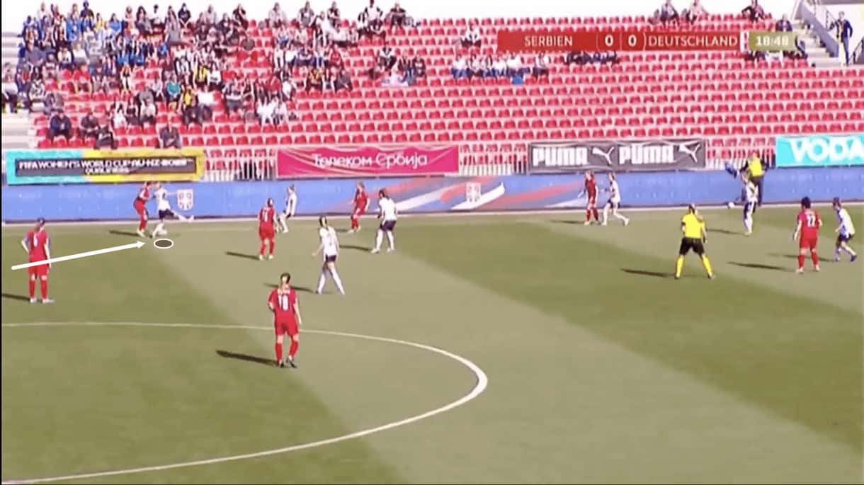 This was some very intelligent play and great technical ability on display from the left centre-back but she was forced to be very, very good here to escape Germany’s aggressive pressure. Not every player Germany come up against will perform this well every time and their aggressive pressure will create chances for them, as well as stifle the opposition’s build-up close to their own goal, which is exactly what Voss-Tecklenburg wants.